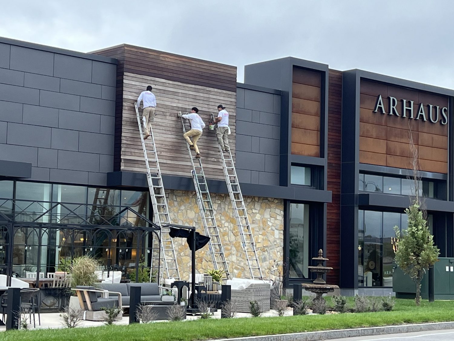Arhaus Furniture hired our team to refresh and protect their building’s exterior. Over time, the building’s exterior had succumbed to typical wear and tear, and the once-vibrant wood finish had faded to a weathered grey.