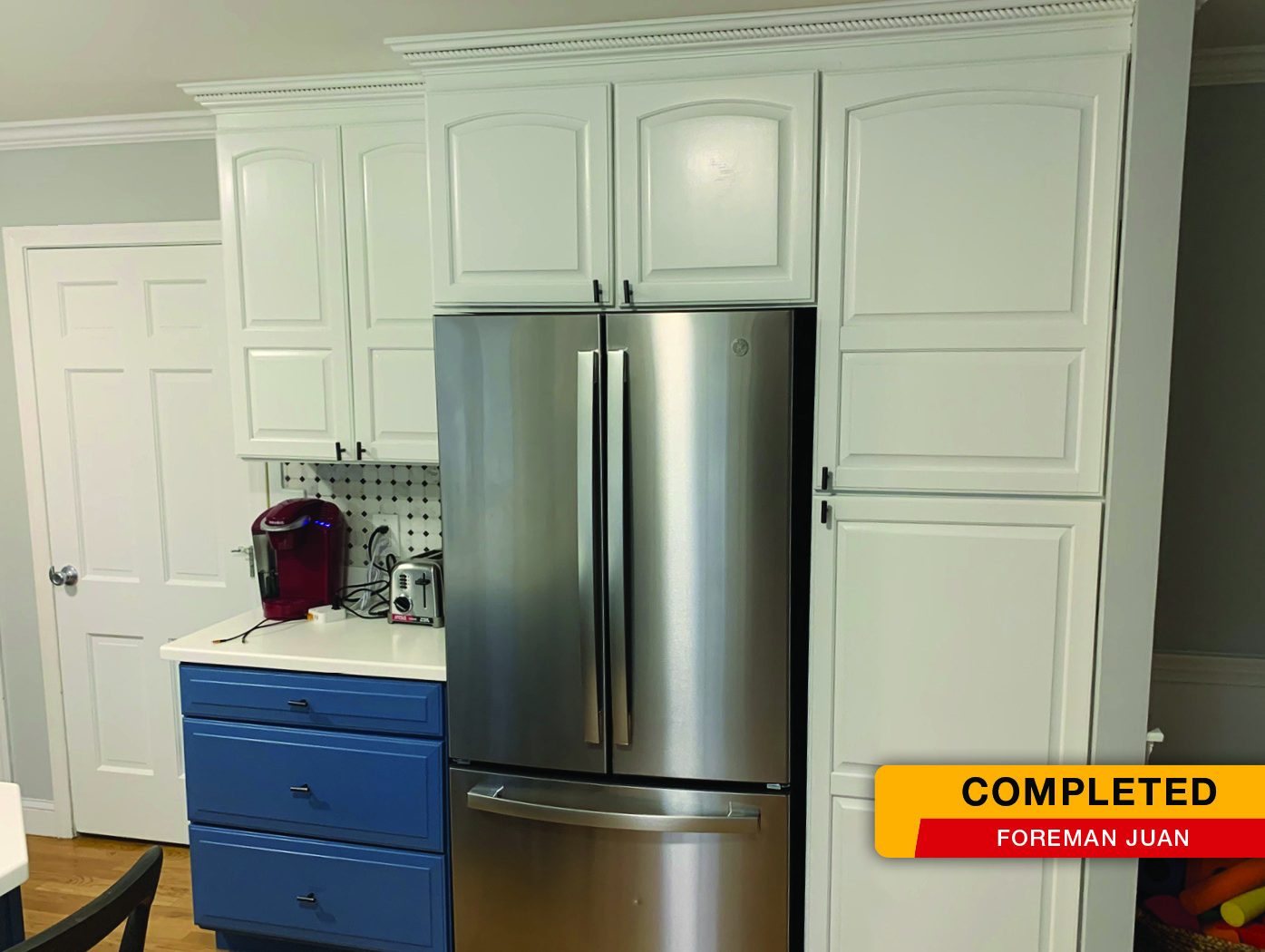 Our CertaPro painters were called to Andover, MA for a kitchen cabinet refresh project. Our customers purchased their home a while ago and wanted their kitchen to make a bold statement, so they chose to paint upper & lower cabinets two different colors. The bottom cabinets were painted a bold blue and the top cabinets were painted a fresh white. Colors used: SW 9149 Inky Blue and SW 7005 Pure White