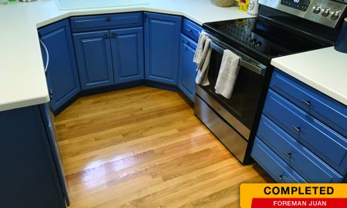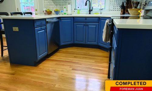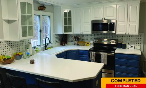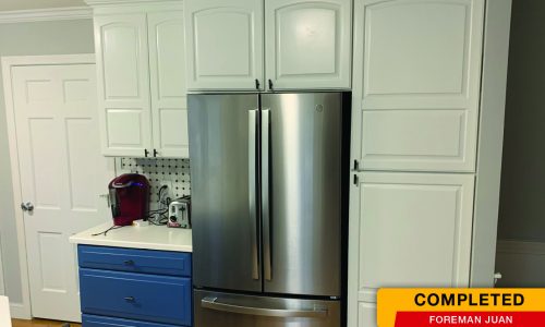 The client purchased their home a while ago and wanted their kitchen to make a bold statement, so they chose to paint the upper & lower cabinets two different colors. The bottom cabinets were painted a bold blue and the top cabinets were painted a fresh white.