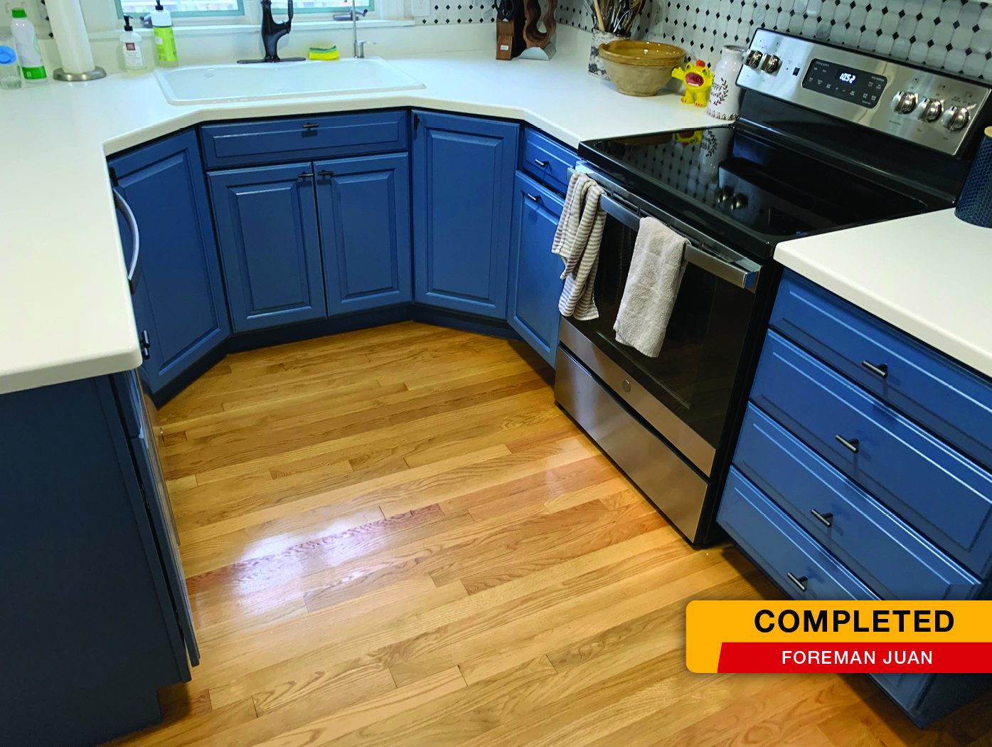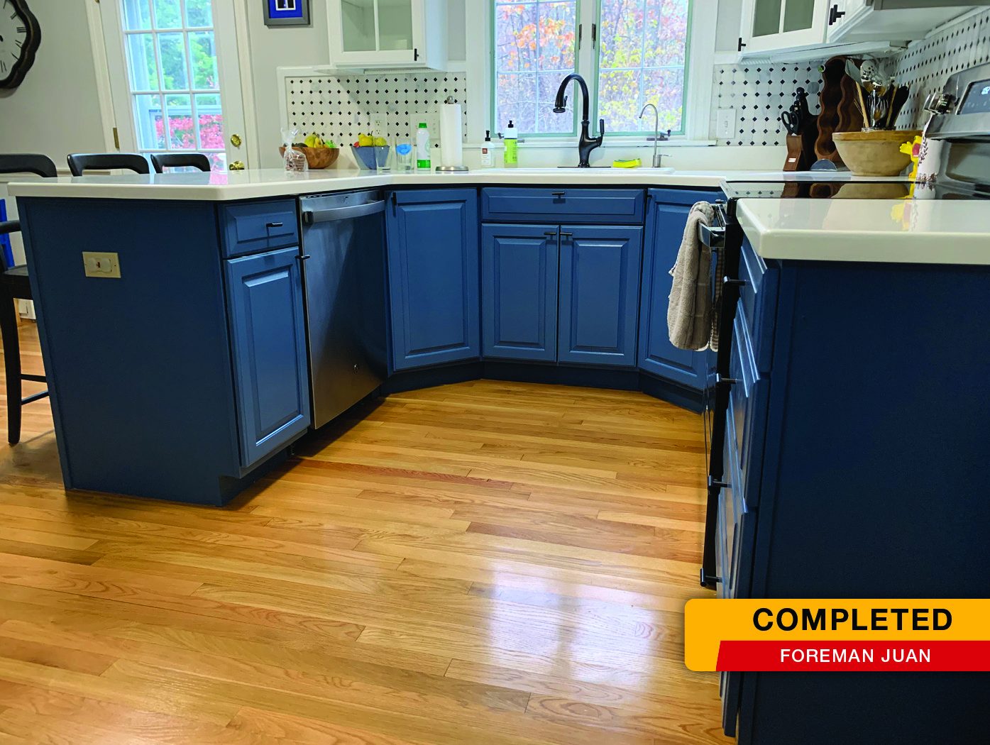 The client purchased their home a while ago and wanted their kitchen to make a bold statement, so they chose to paint the upper & lower cabinets two different colors. The bottom cabinets were painted a bold blue and the top cabinets were painted a fresh white.