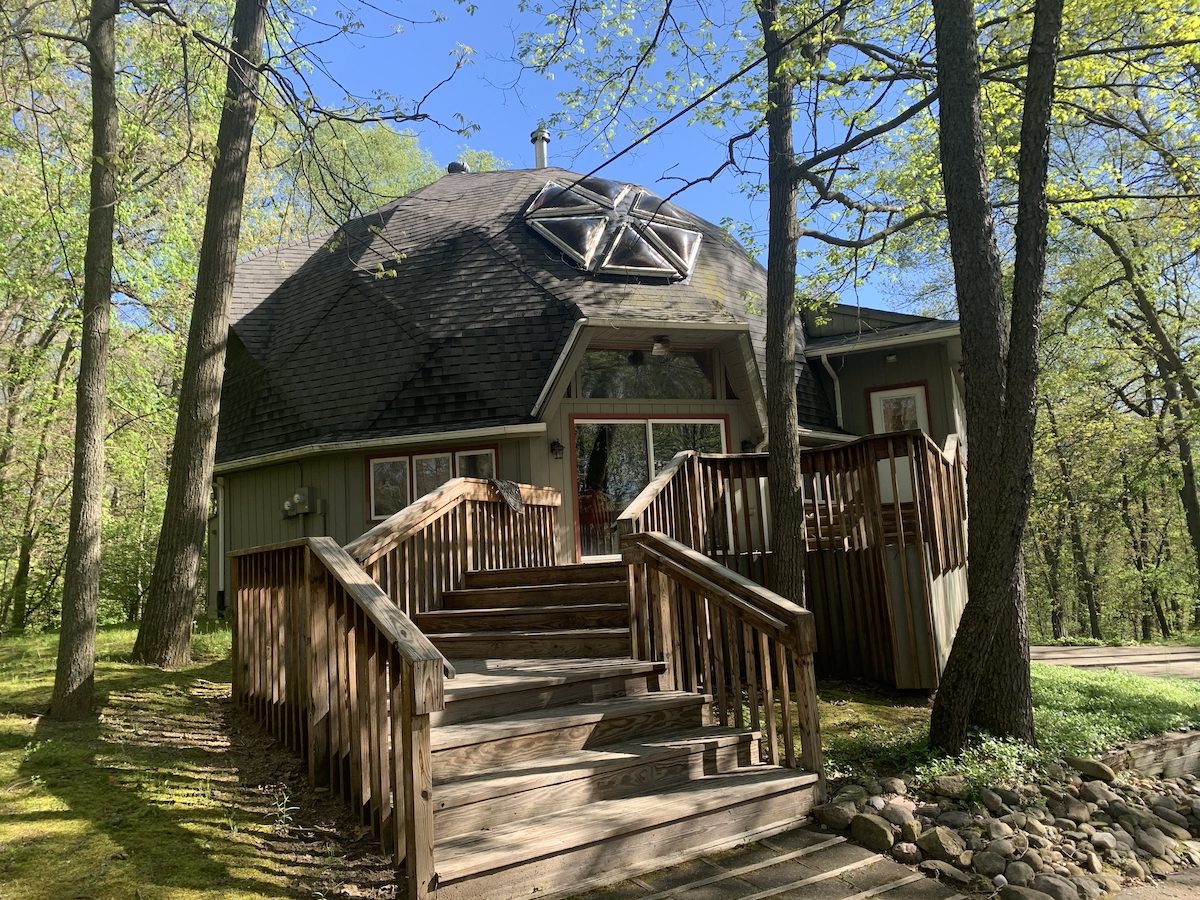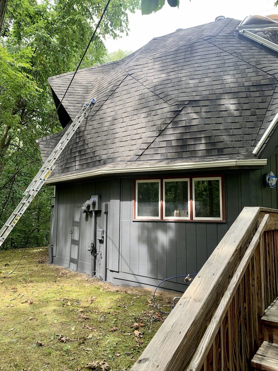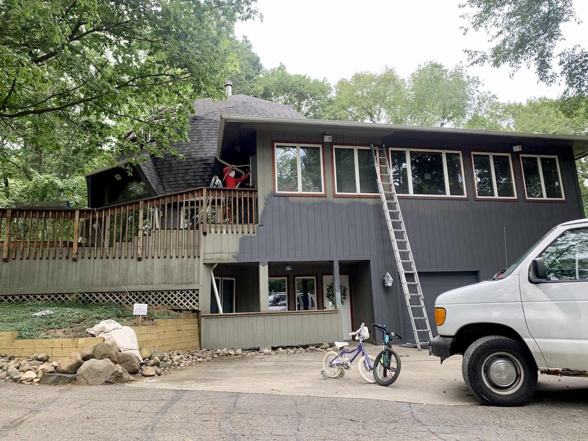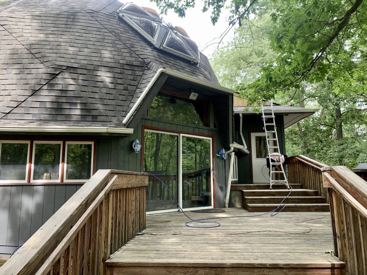 This unique home, its decks, exterior stairs, and garage doors were all repainted to protect the home from the elements and give it a whole new look.