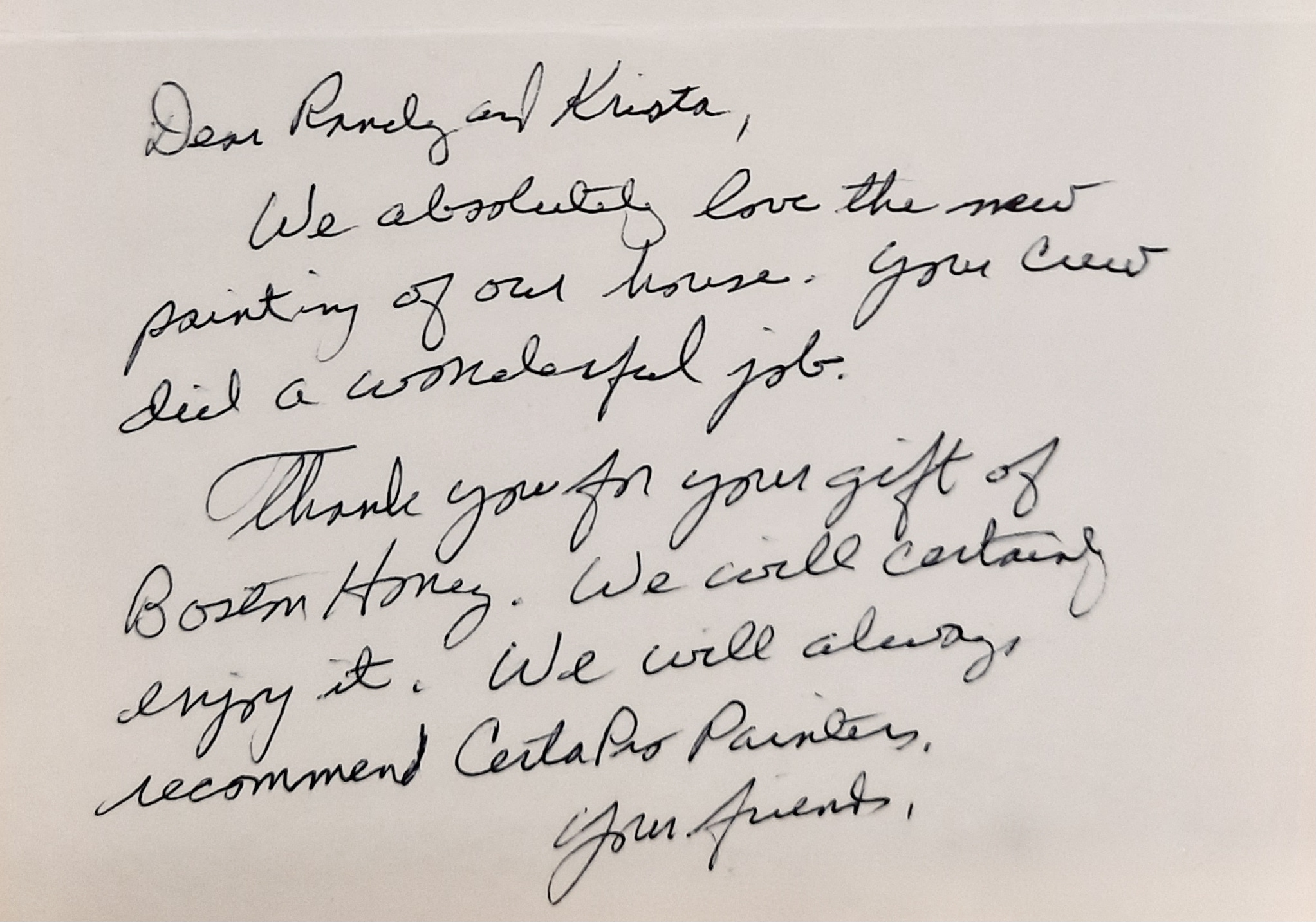 The CertaPro Painters of the Upper Charles, MA team received a special, handwritten thank you from a satisfied customer. See the note below, which reads:
