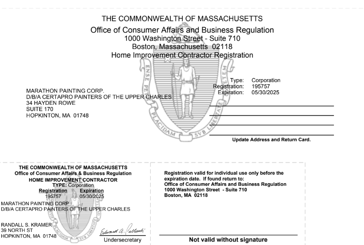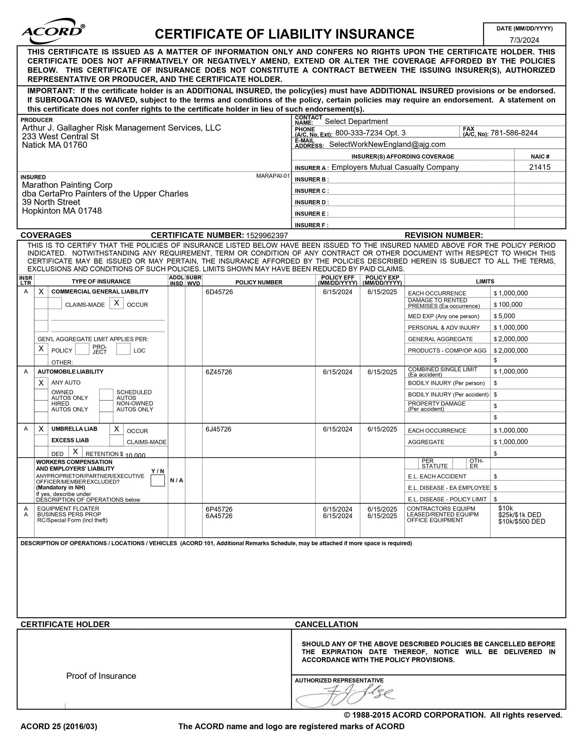 Welcome to CertaPro Painters® of the Upper Charles Insurance Certificates page. We understand the importance of transparency and assurance when it comes to the services we provide. As a part of our commitment to quality and professionalism, we proudly present our Certificates of Insurance for your peace of mind: