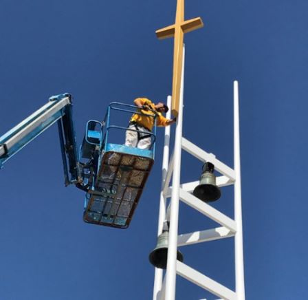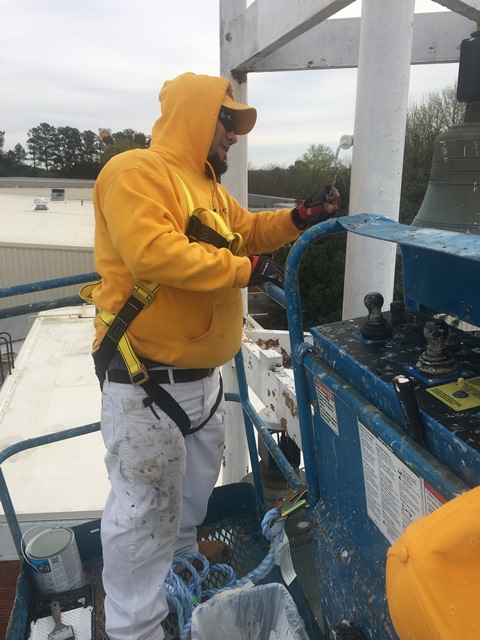 In April of 2018, our crews completed a very special project for a local high school here in the Atlanta area. CertaPro Painters of Atlanta helped St. Pius X Catholic High School prepare for their 60th anniversary celebration in November by giving the beloved bell tower a fresh new look! Due to the tower’s close proximity to the building on two sides, access proved to be somewhat of a challenge, requiring a slightly larger 65′ knuckle boom lift. This piece of access equipment allowed our painters the ability to position the base of the lift well away from the tower, clear of two small concrete staircases, and still have plenty of ability to work 360 degrees around the structure. After a full day of prep work, our crews applied Sherwin-Williams Pro Industrial Pro-Cryl Universal Acrylic Primer, as well as two coats of Sher-Cryl High Performance Acrylic top coat.