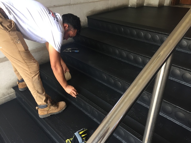 After a thorough powerwashing of the areas, the steps were coated with one coat of Sherwin Williams, ARMORSEAL Tread-Plex, semi-gloss, water-based paint. Upon completion of the painting and once the product had dried, CertaPro Painters of Atlanta crews installed new 3M Slip Resistant tape on the stair treads.