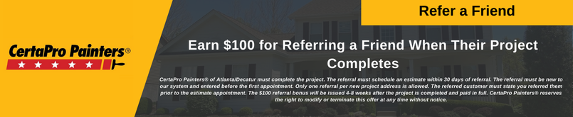 CertaPro Painters® of Atlanta/Decatur must complete the project. The referral must schedule an estimate within 30 days of referral. The referral must be new to our system and entered before the first appointment. Only one referral per new project address is allowed. The referred customer must state you referred them prior to the estimate appointment. The $100 referral bonus will be issued 4-8 weeks after the project is completed and paid in full. CertaPro Painters® reserves the right to modify or terminate this offer at any time without notice.