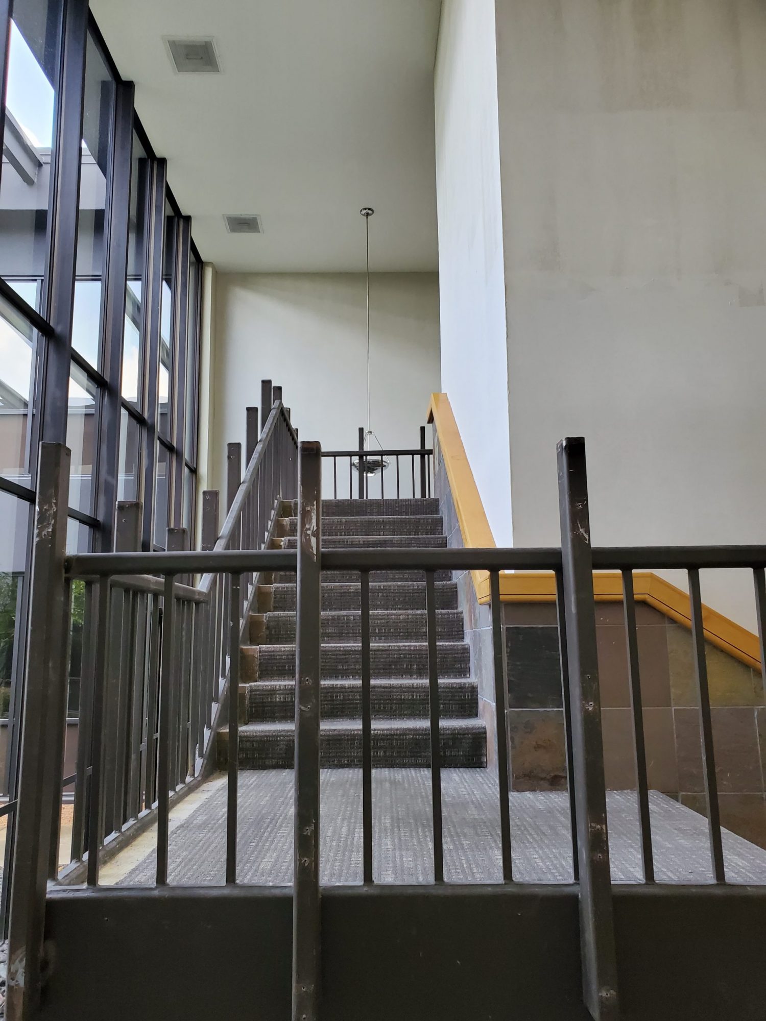 This picture shows one of the stairwells. Rooms like this often have high walls and ceilings that require equipment and technique to properly paint.