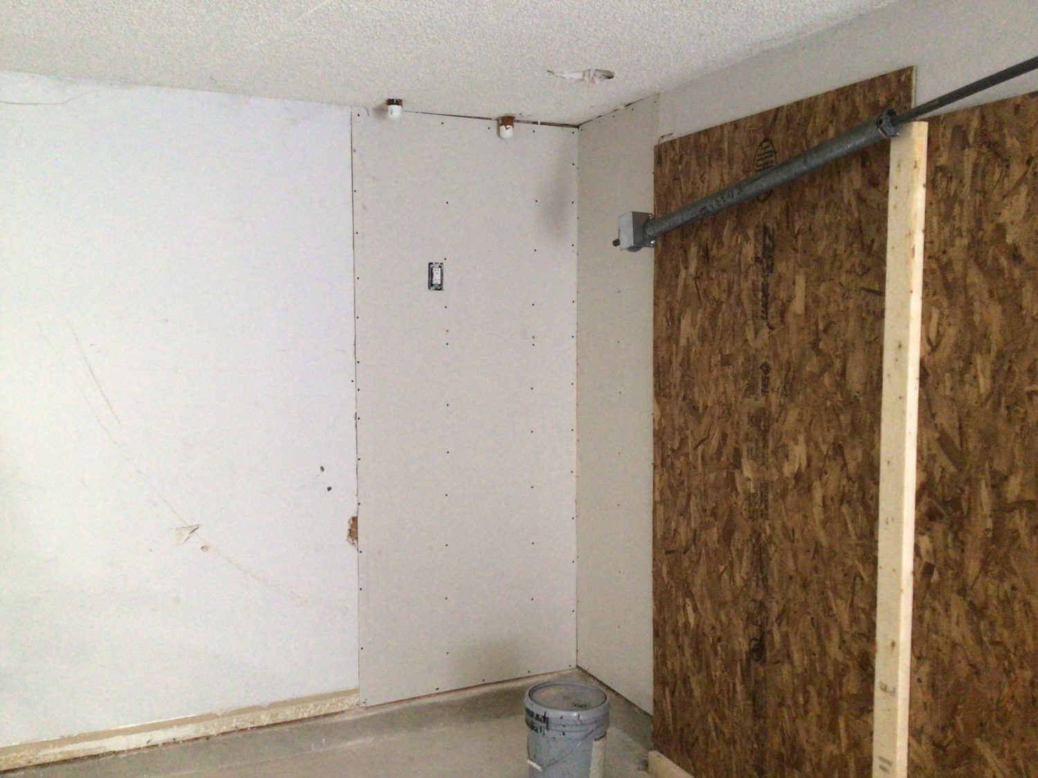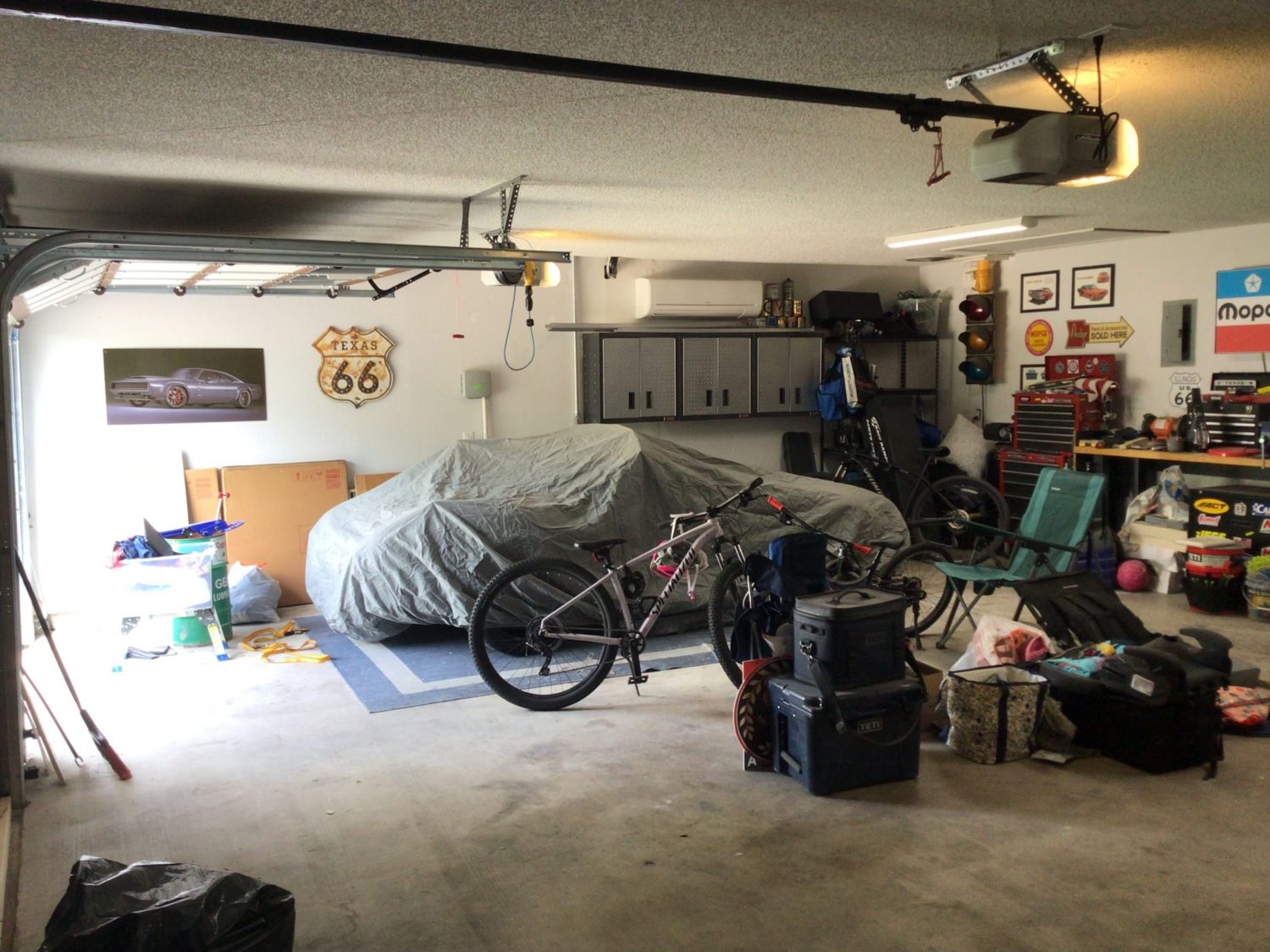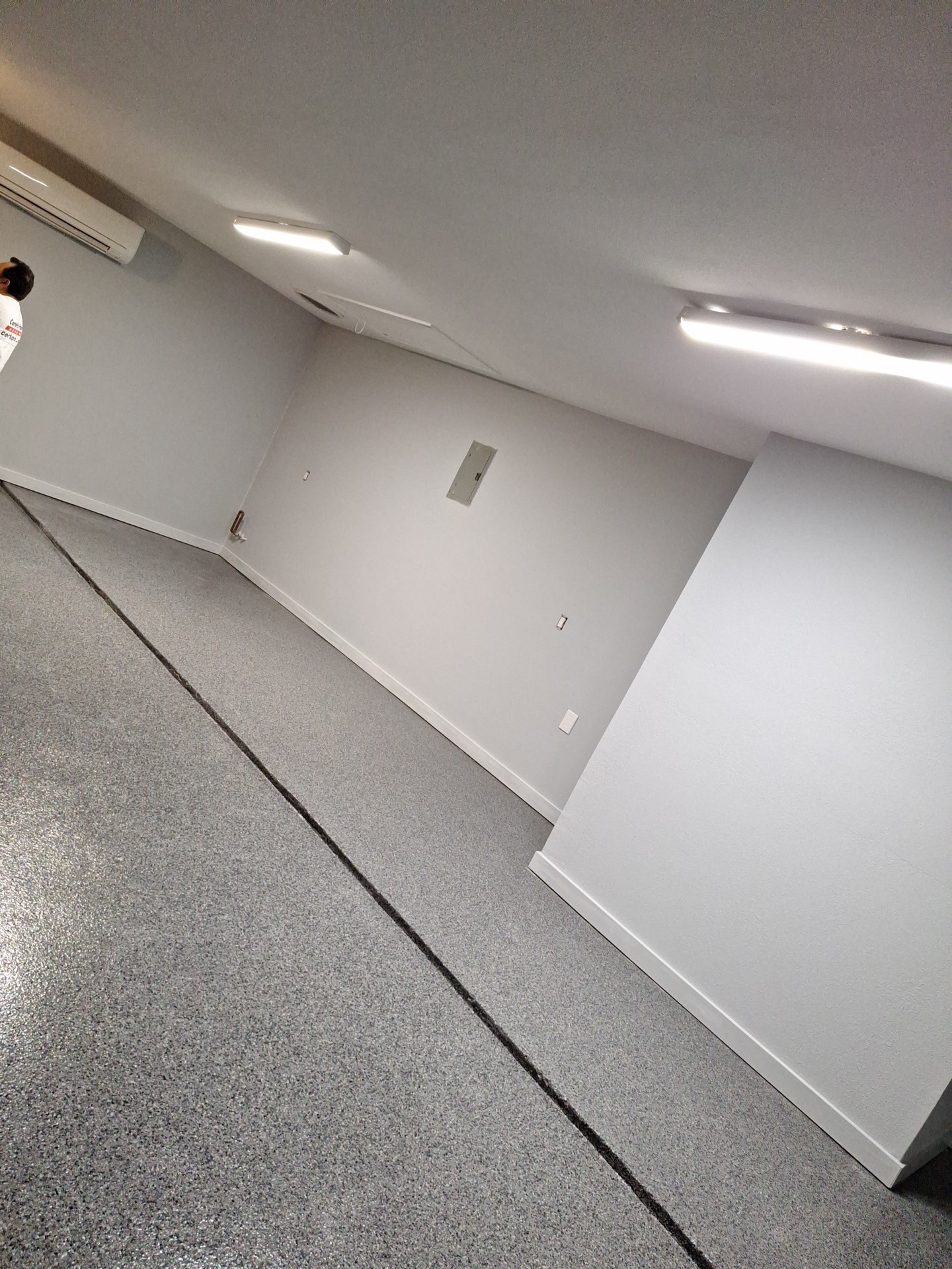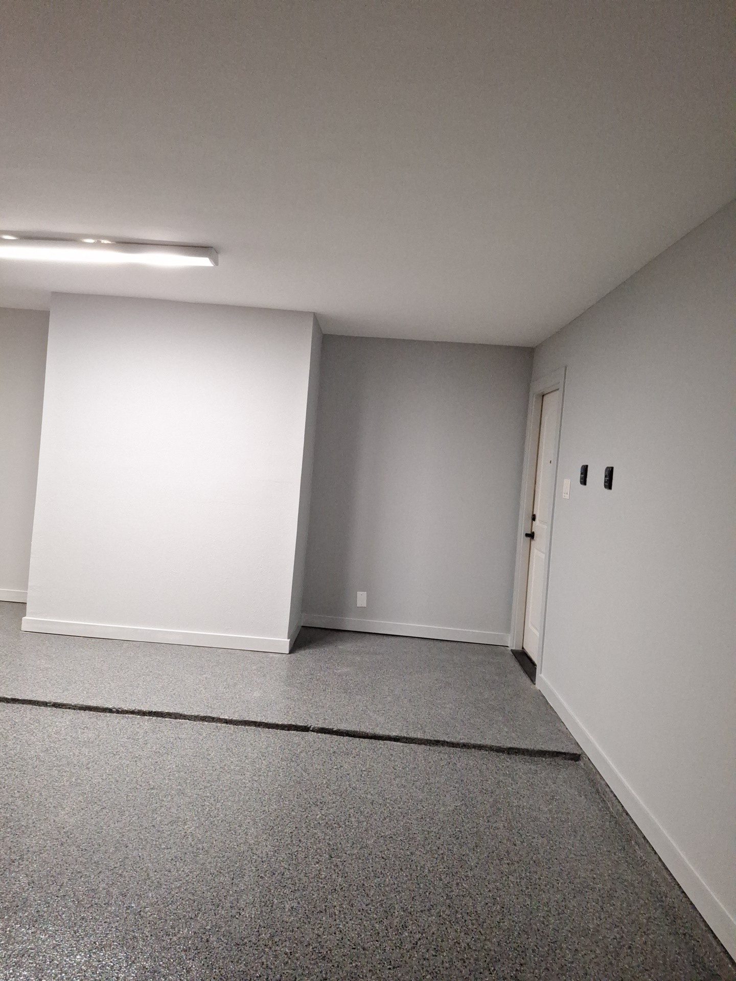 | We gave this garage a complete makeover from top to bottom! The old, popcorn ceiling texture was removed and the remaining, sagging sheetrock was tightened before we applied a new, light orange peel texture. The ceiling was then fully primed and painted with 2 coats of Sherwin Williams paint in the “Pure White” color. The walls required plenty of taping, floating, filling of holes, and texturing prior to spot-priming and finally applying 2 coats of Sherwin Williams paint in the “Gray Screen” color. We installed new baseboards and new door frame trim prior to painting all of the trim in the “Gray Screen” color as well. Finally, the old, concrete floor was grinded and sanded and a brand new epoxy coating was applied with “Nightfall” colored flakes and a clear polyaspartic top coat sealant with a lifetime warranty. What a transformation! |