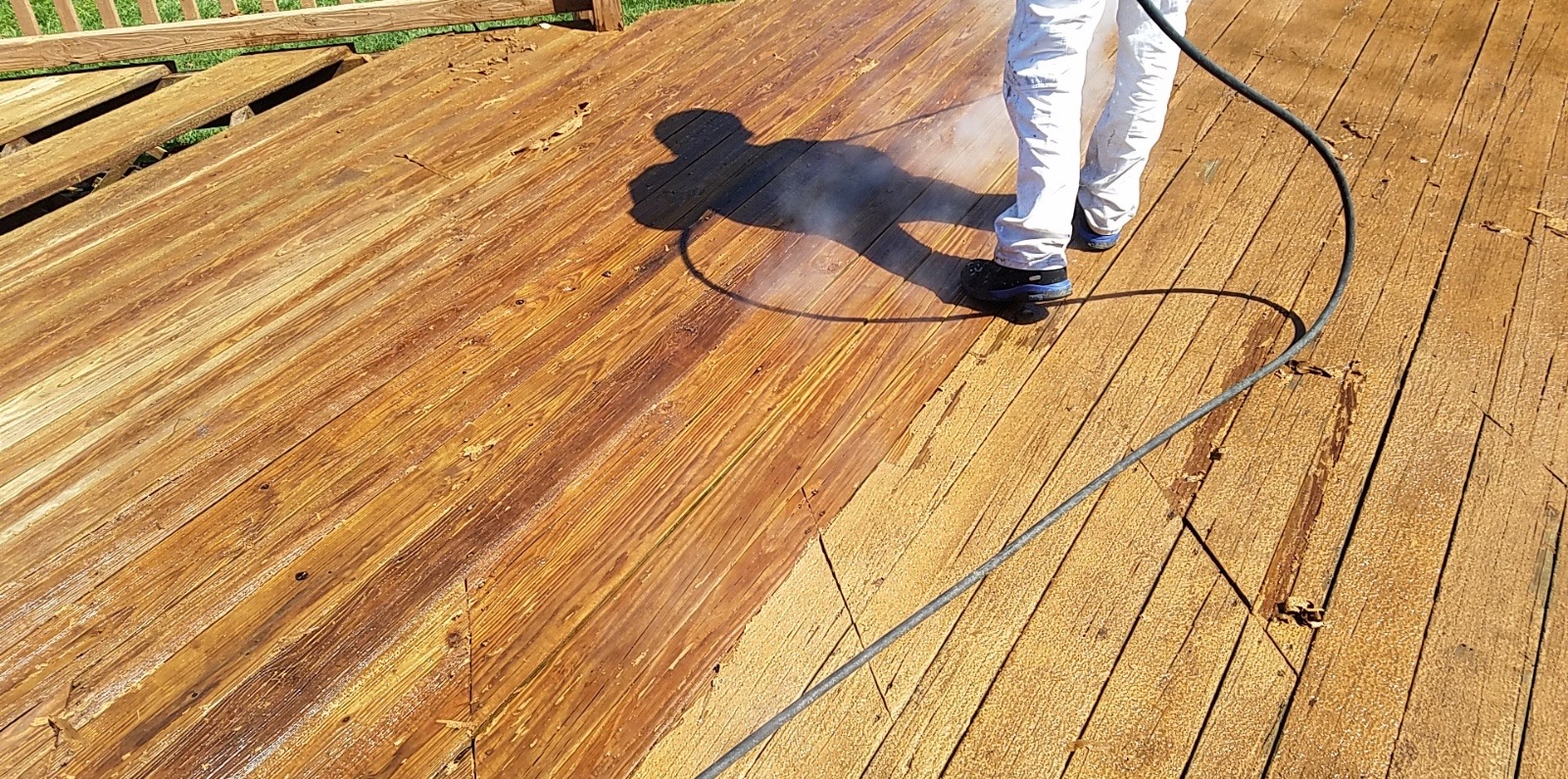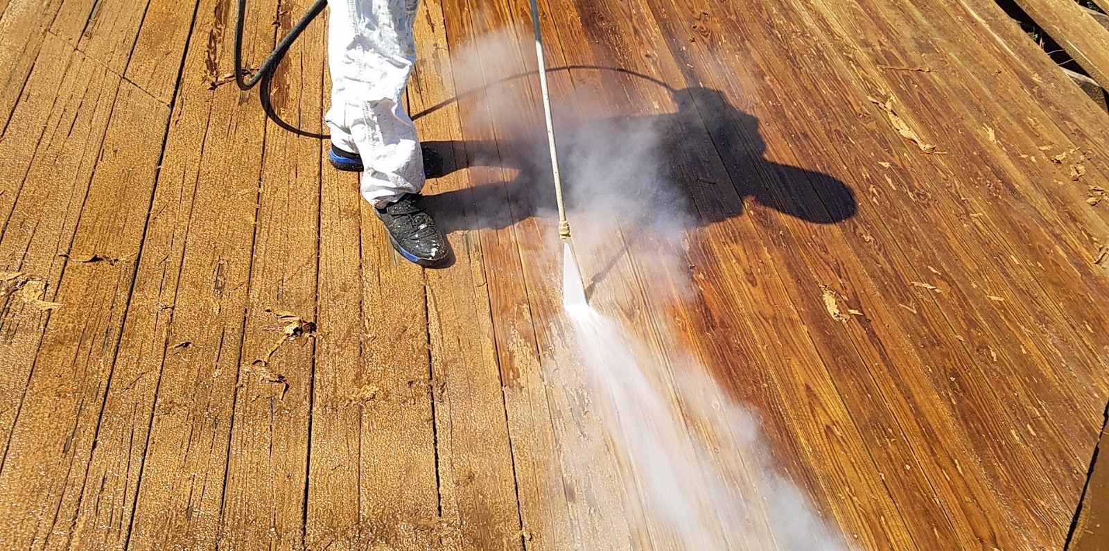 We’re using our Hot Water Power Washer on this deck to remove Deck Over Stain that was peeling on this deck before resealing it with a solid color stain