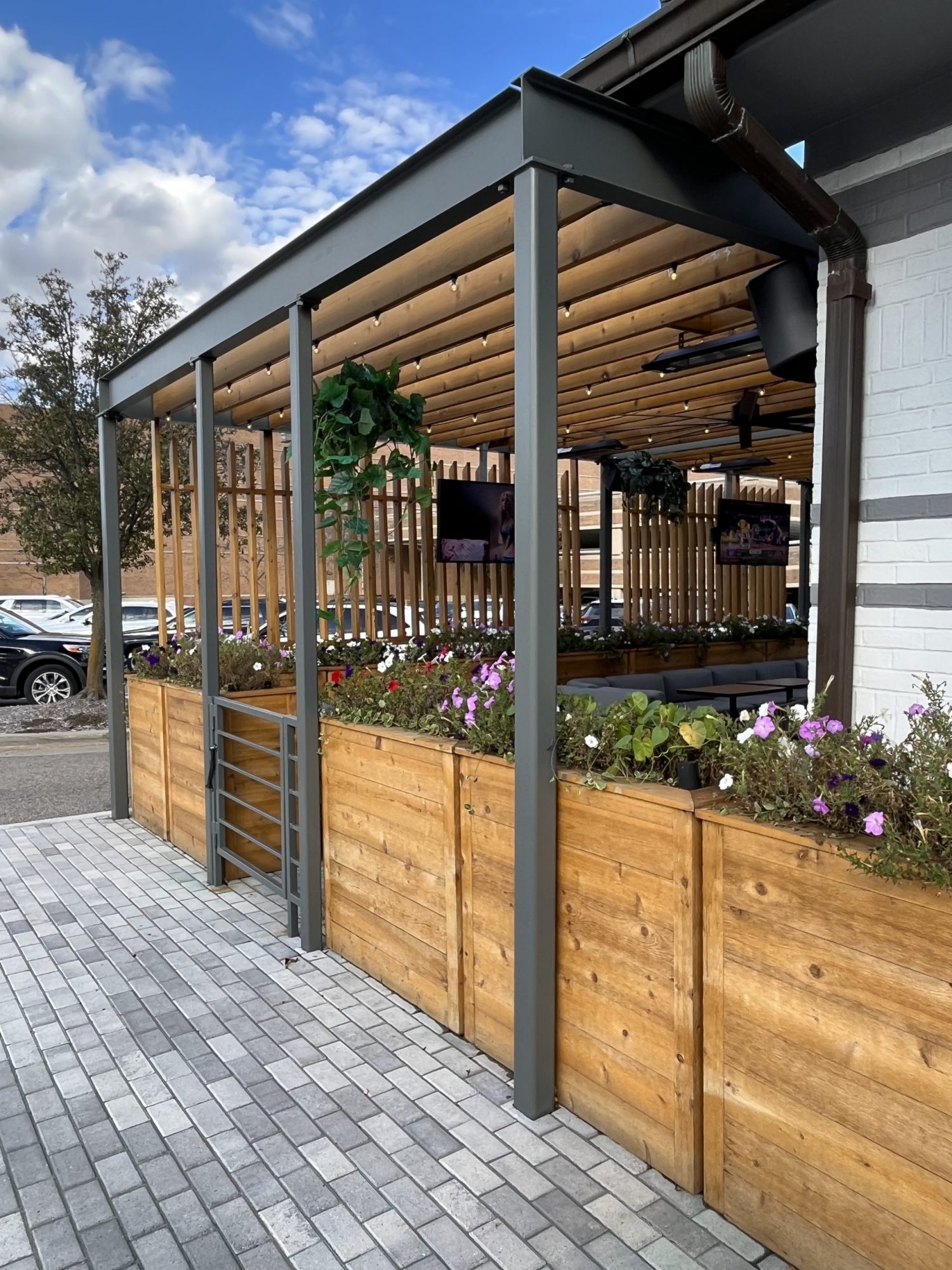 The professional painters of CertaPro Painters of Birmingham-Troy were brought in to paint the metal pergola framing, railing and gates at the DraftKings Sports and Social Troy outdoor patio. This refresh project included some removal and sealing of rust before painting the surfaces with an industrial DTM paint in a custom color match.