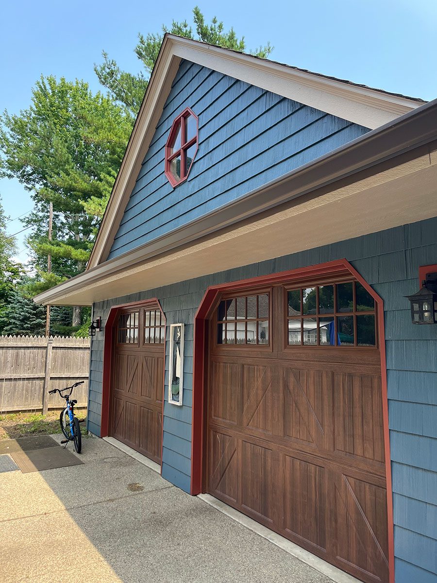 It was a true team effort to plan and execute the striking color scheme from the home itself down to the unique and asymmetrical architectural details. This included painting a red diamond accent within the beige diamond panel alongside a single oval window for a sense of symmetry. The work began with replacing shingles and wood where needed to preserve the integrity of the home, while a satin sheen was applied for added protection along the waterfront.