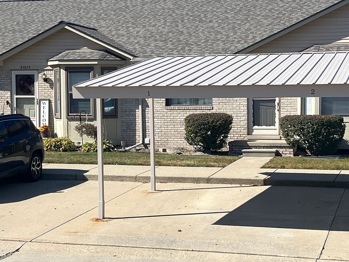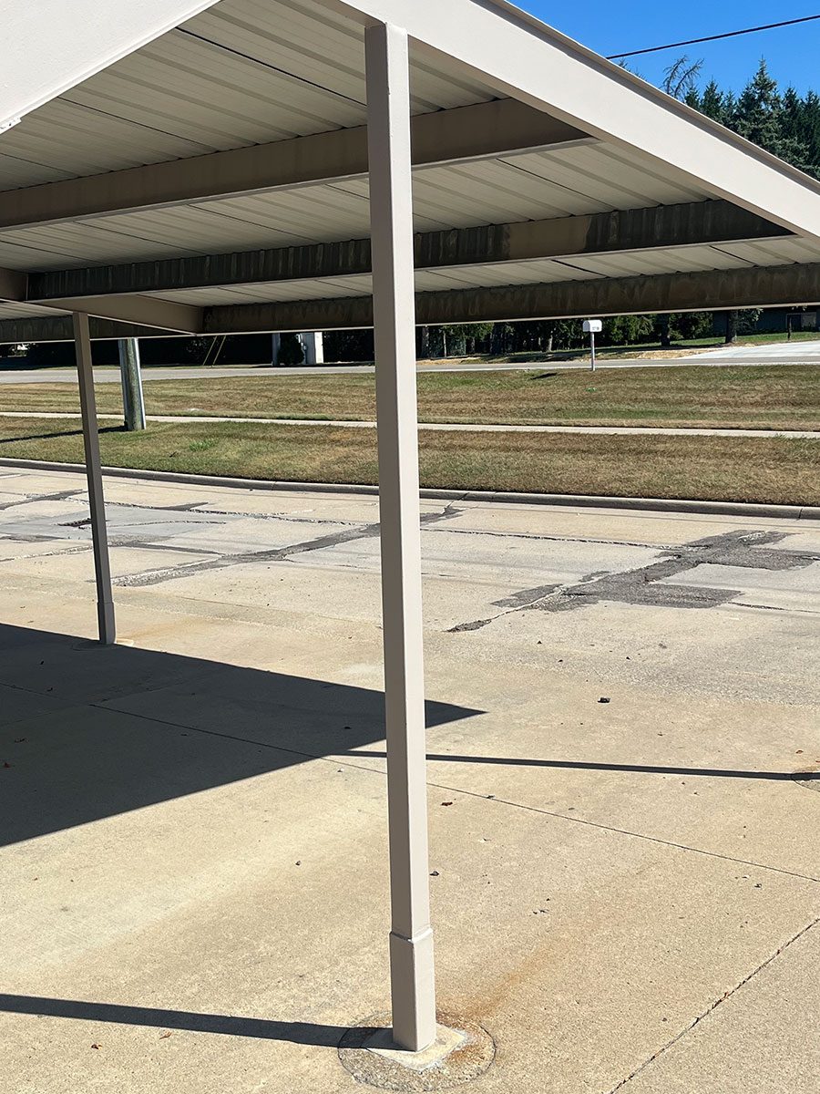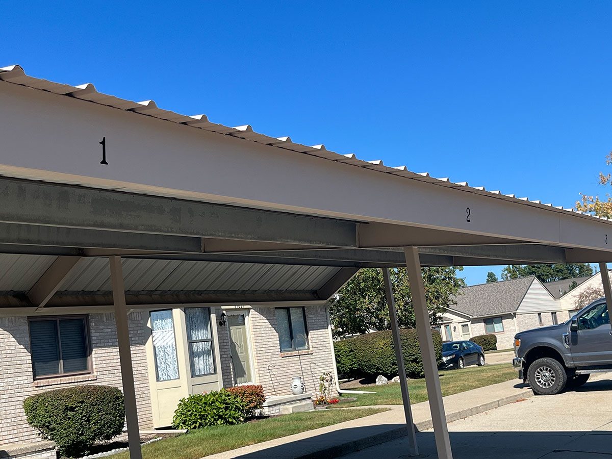 The pros of CertaPro Painters® of Birmingham-Troy re-painted this condo community’s metal carports. Before refinishing them, we did extensive prep work to clean up and smooth out the structures. This included thoroughly cleaning the surface, removing rust and sealing the vulnerable areas, sanding down rough areas with a grinder and using Bondo Metal Reinforced Filler where needed. After applying Sherwin Williams Pro Industrial products, we also installed the parking space numbers.