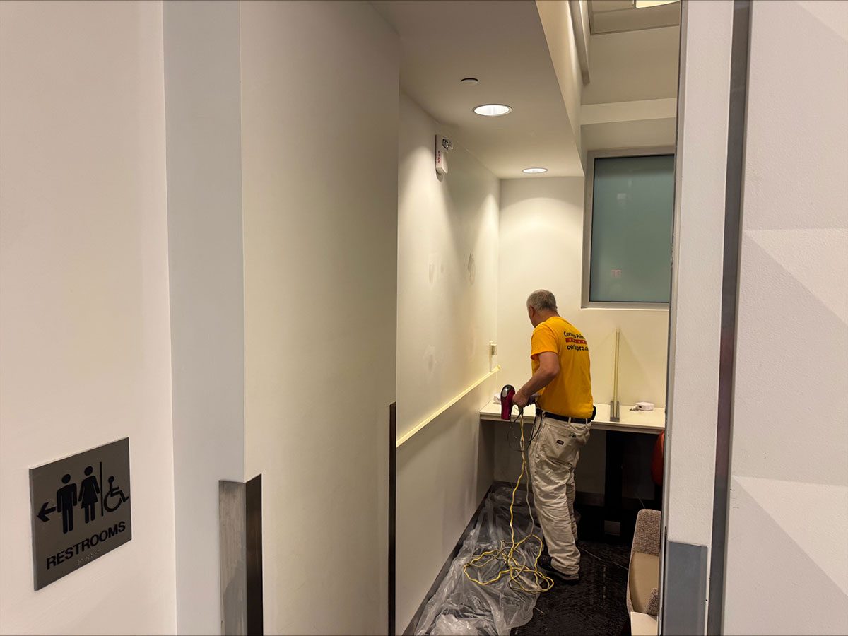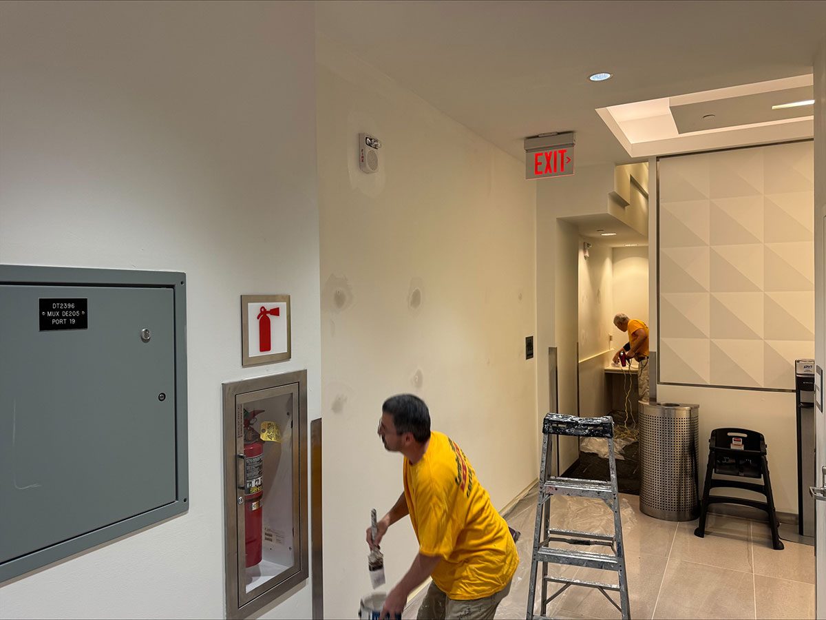 The project involved prepping and painting the walls in the PHL Delta Sky Lounge inside the airport. The work needed to be completed immediately. The estimate was conducted right away, and the job was completed the following day. Due to the high-traffic environment, all work had to be performed overnight. The crew was required to go through security and provide identification to be cleared for access. The entire project was completed in one night. Benjamin Moore Ultra Spec OC-57 White Heron was used on the walls.
