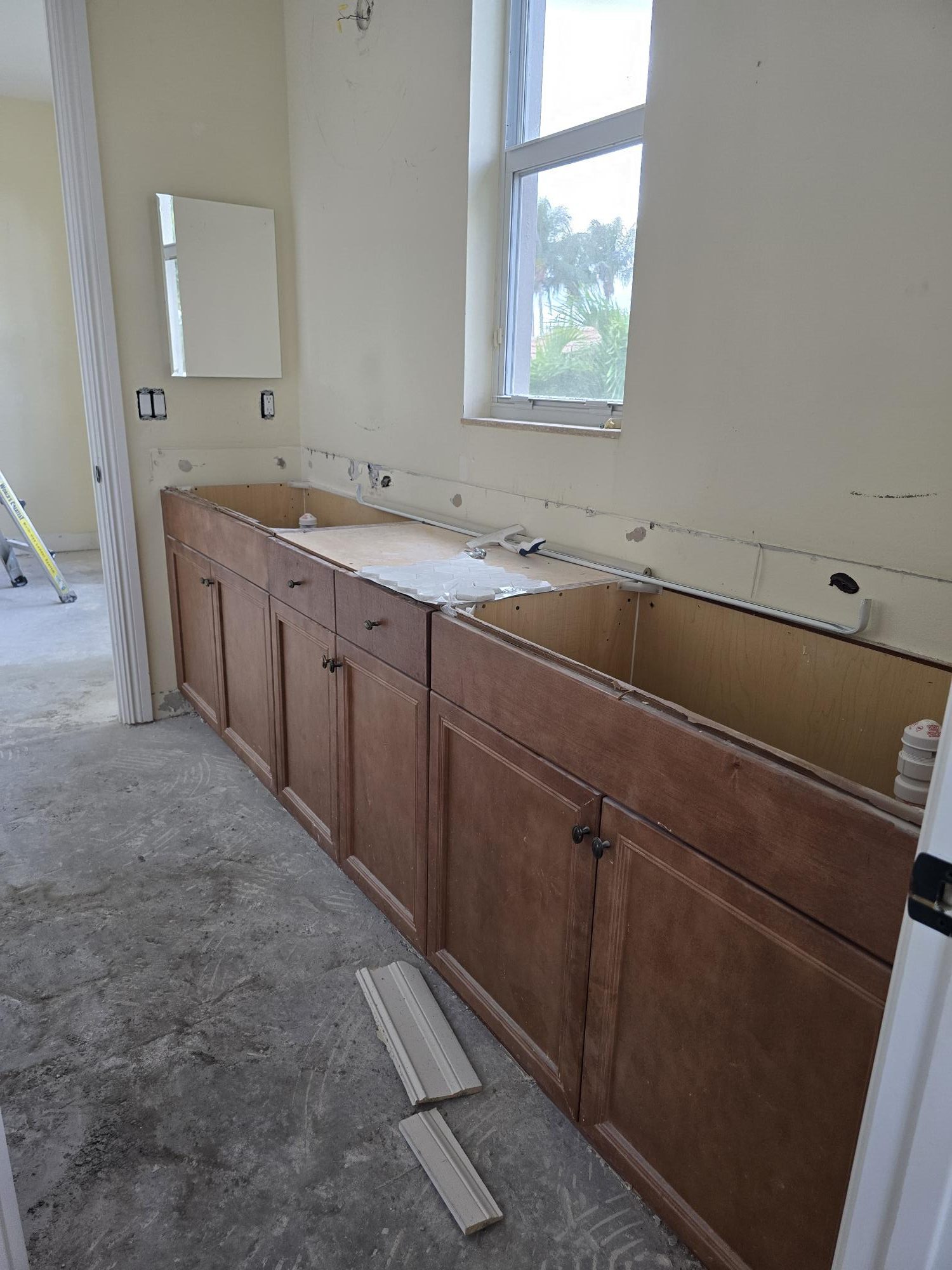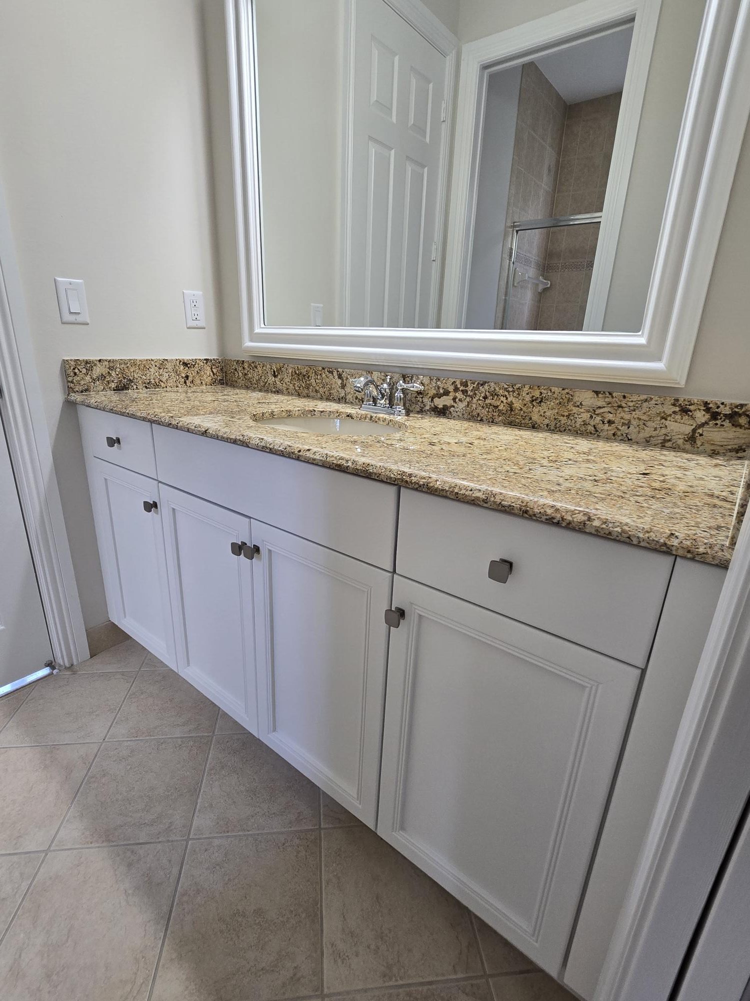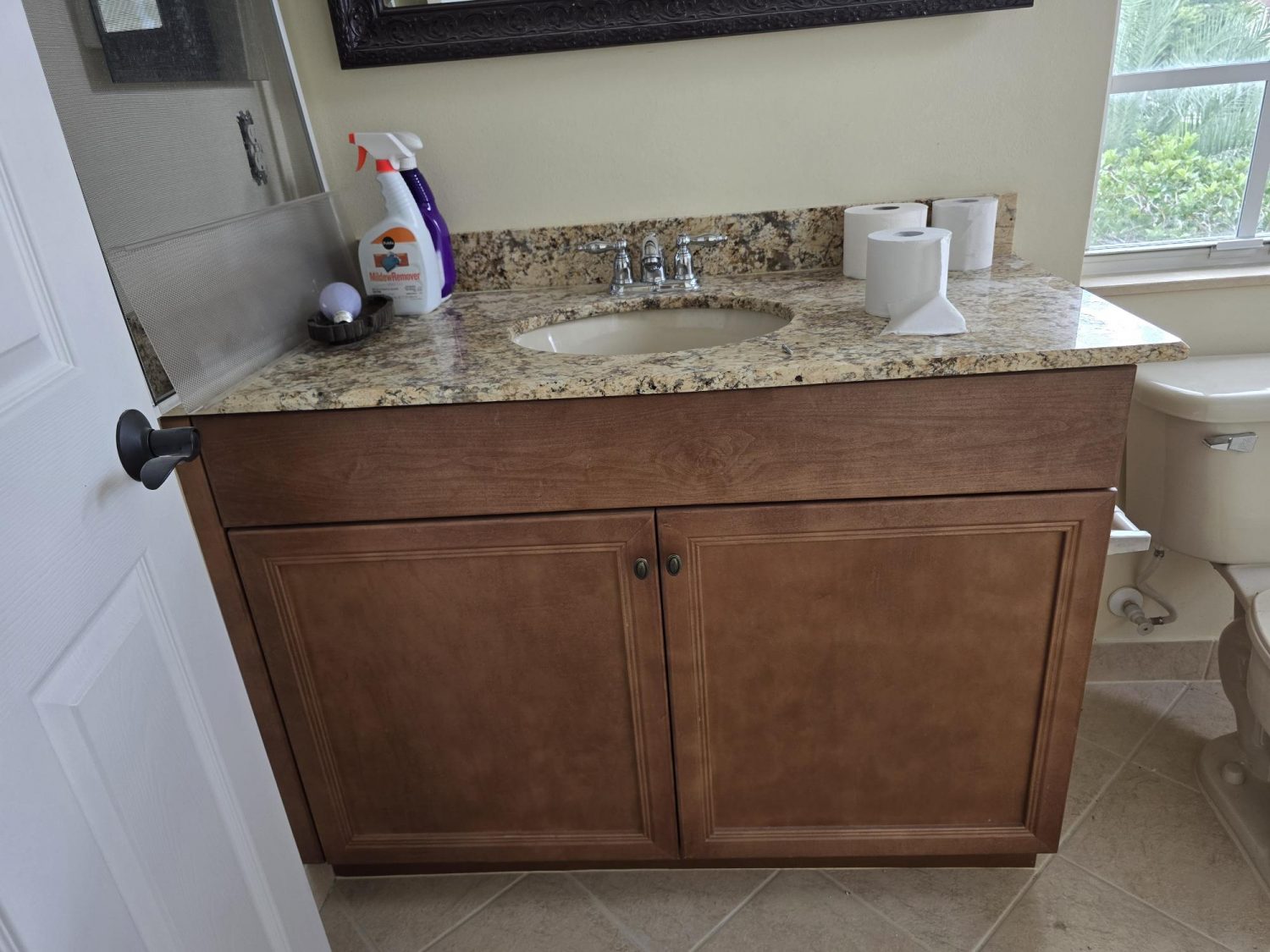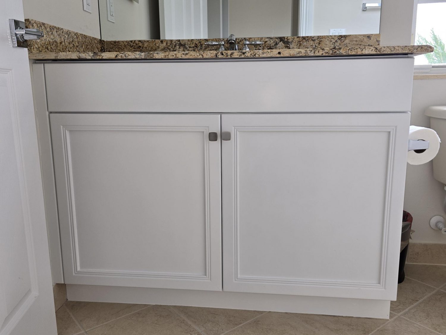 Scroll through to see before, during, and after of this bathroom cabinetry painting and refinishing project our team completed.
