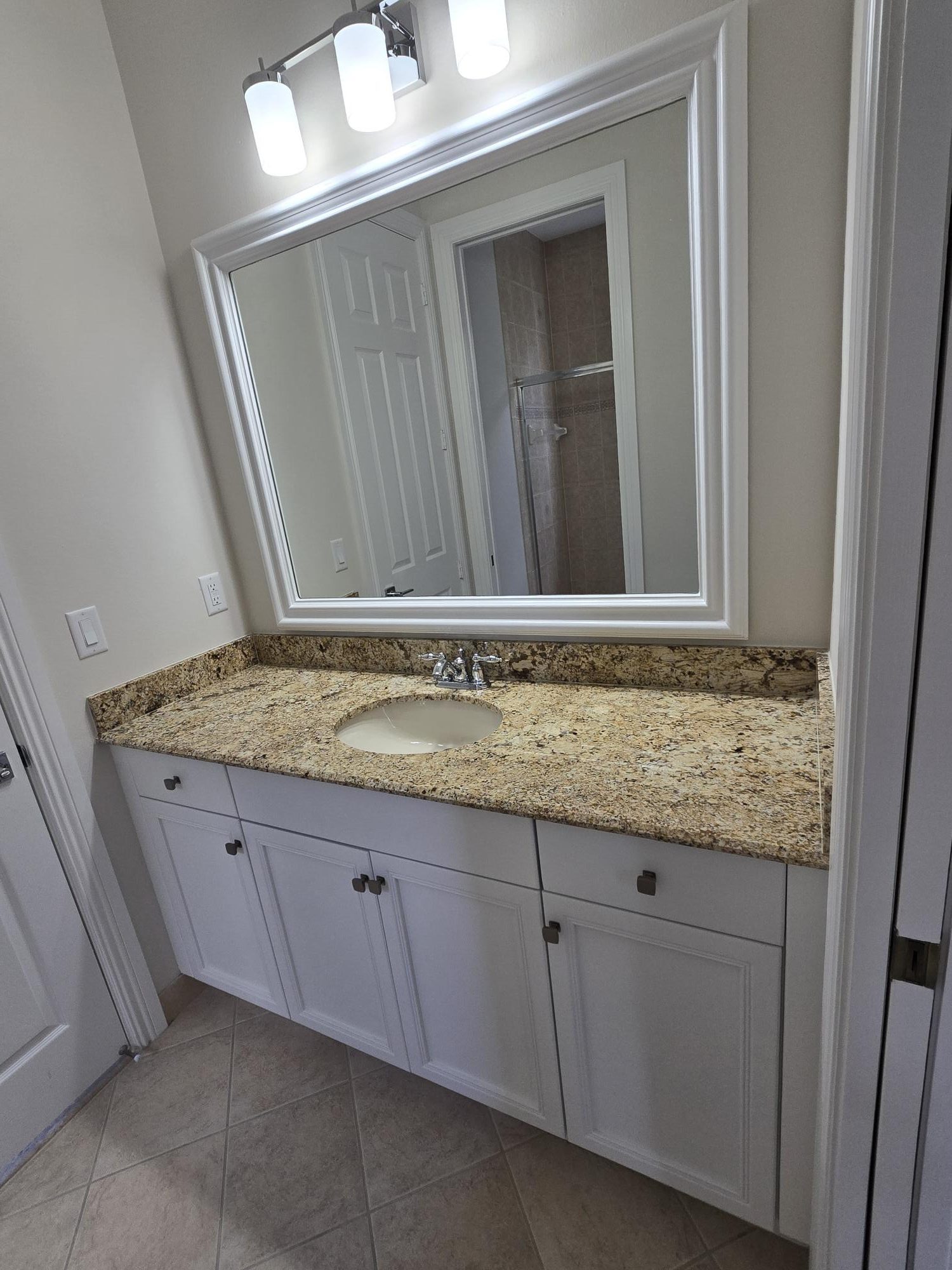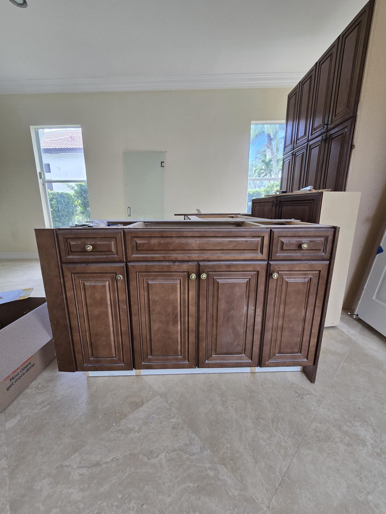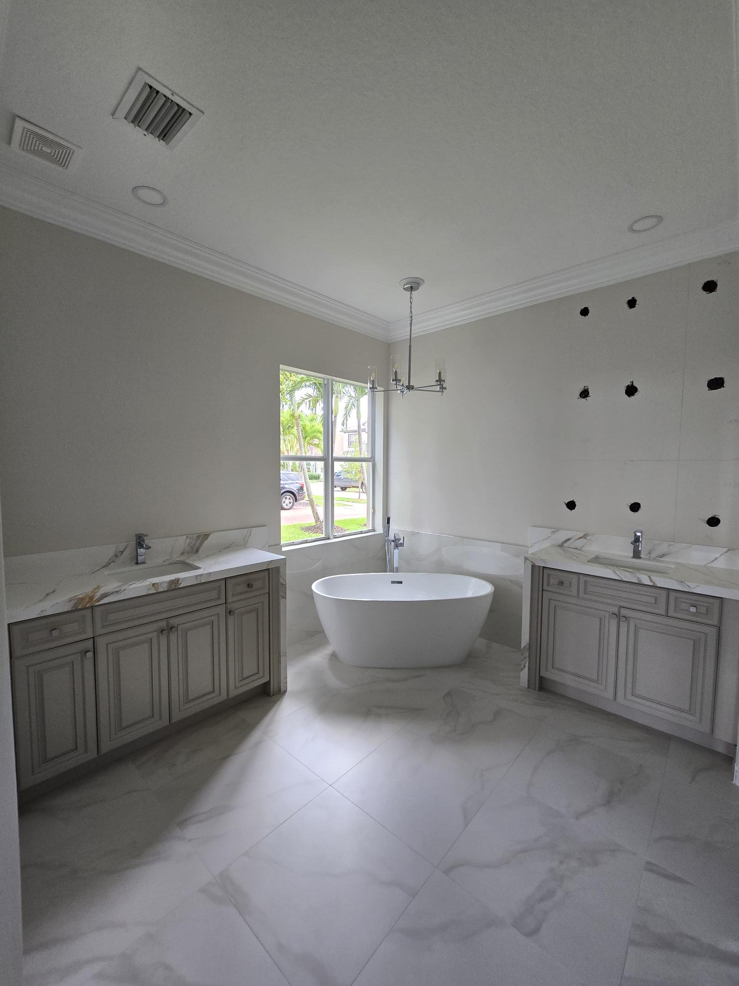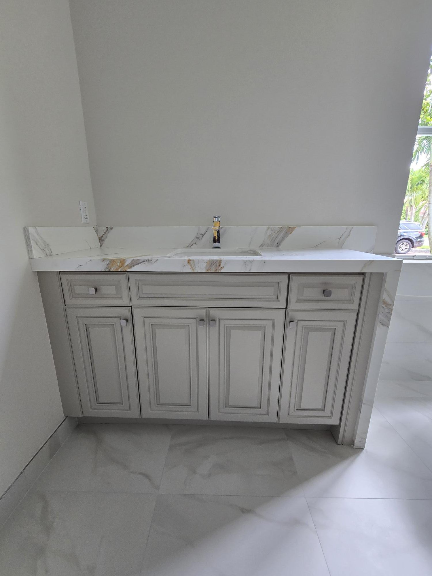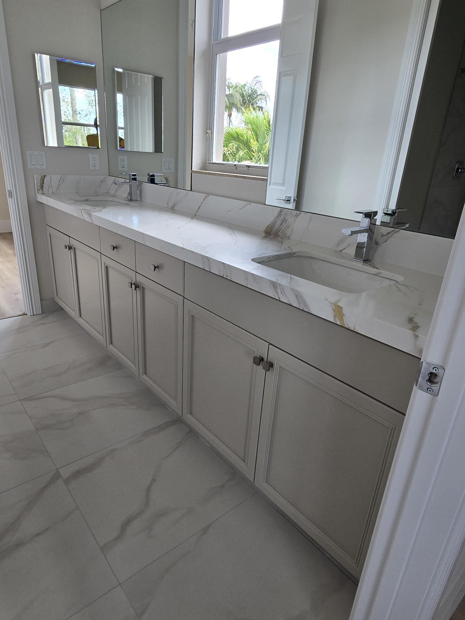 Scroll through to see before, during, and after of this bathroom cabinetry painting and refinishing project our team completed.