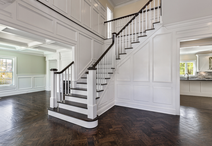 Crown and dental moldings, wainscot, and other decorative interior moldings give a polished look.