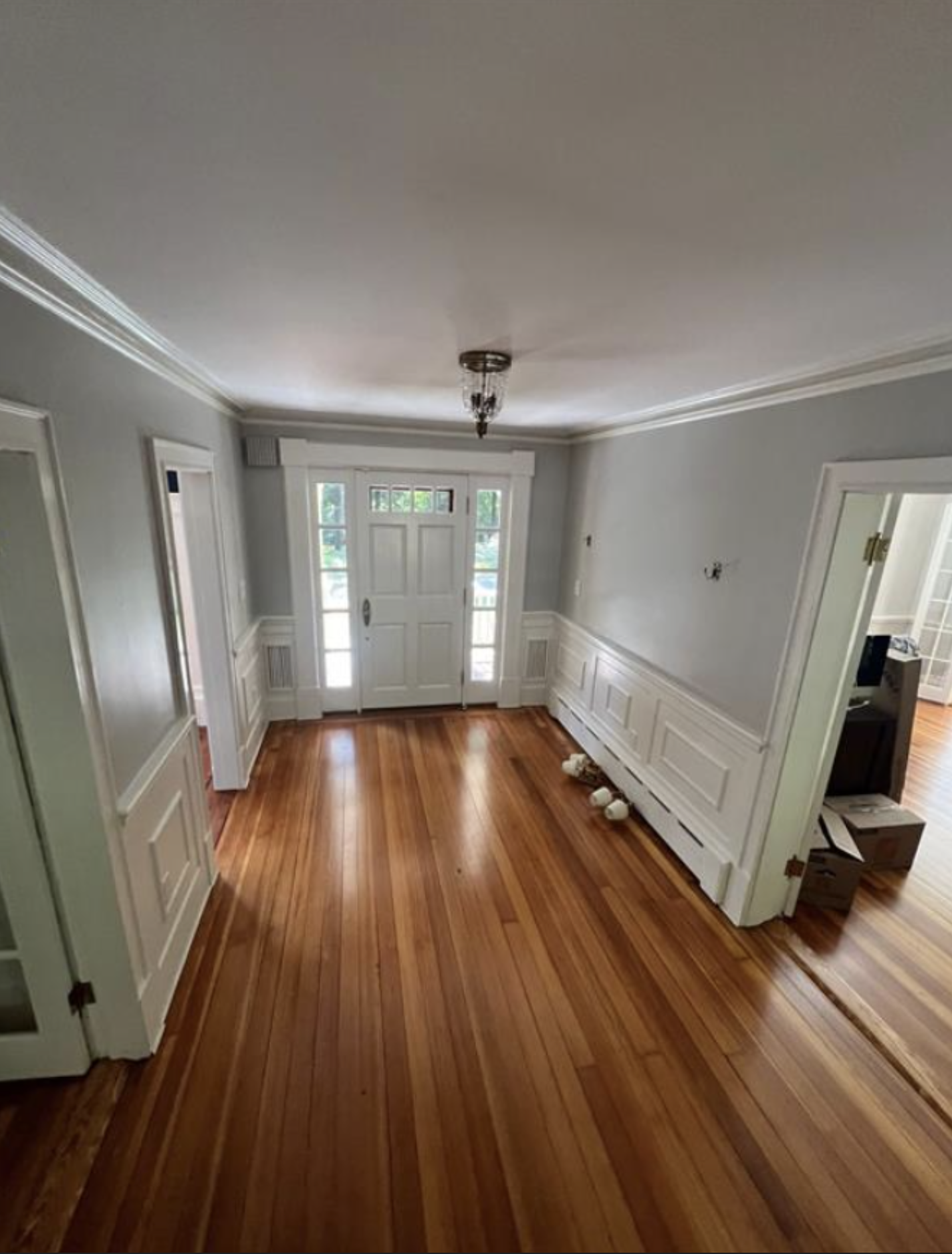 This interior received a modern monochrome look for both the staircase and foyer with gray walls meeting off-white trim, topped off with a black stair railing.