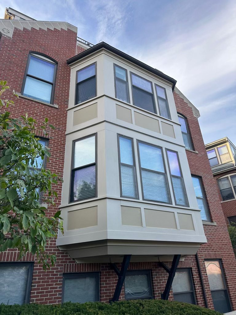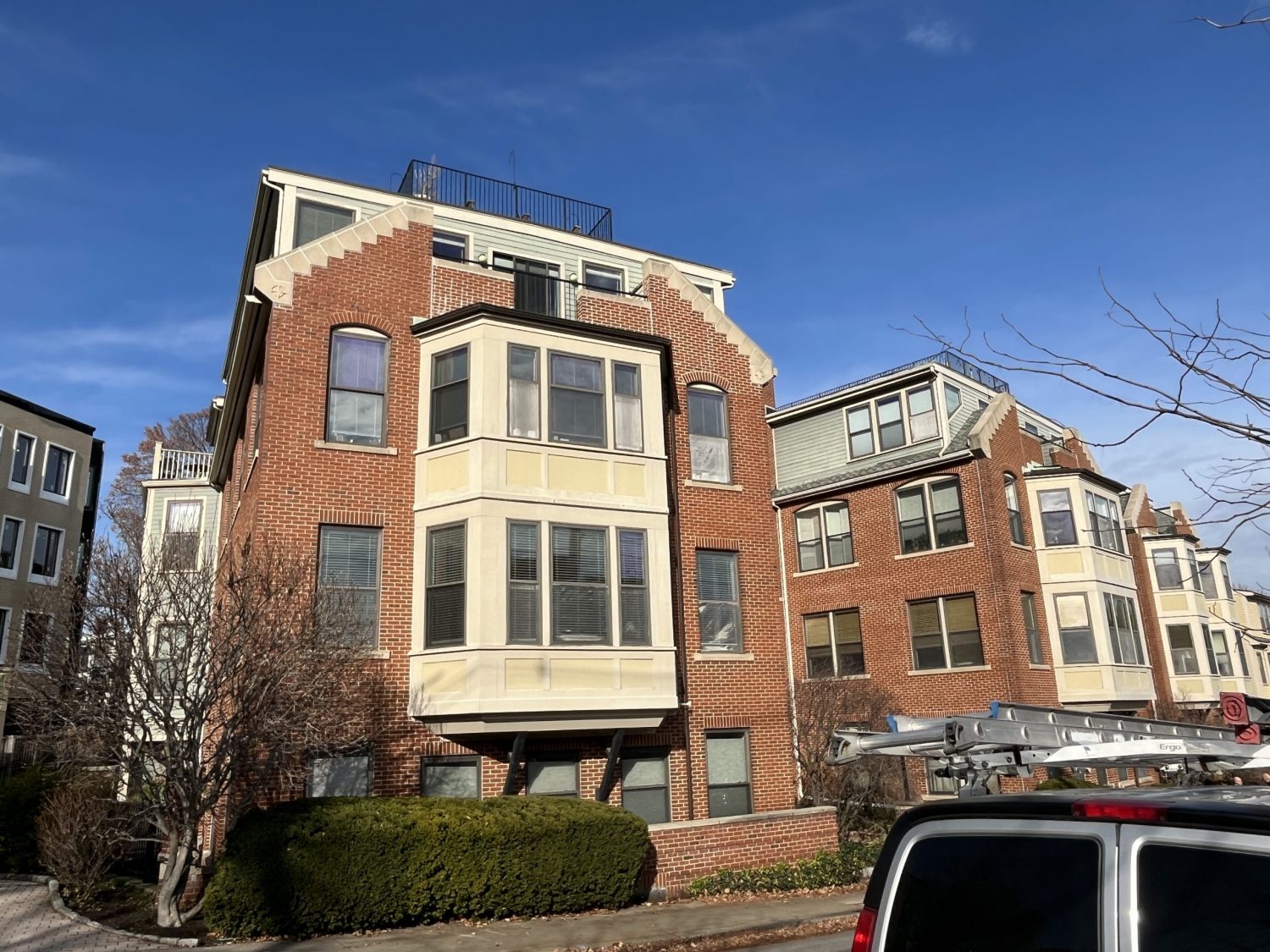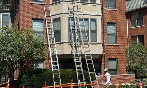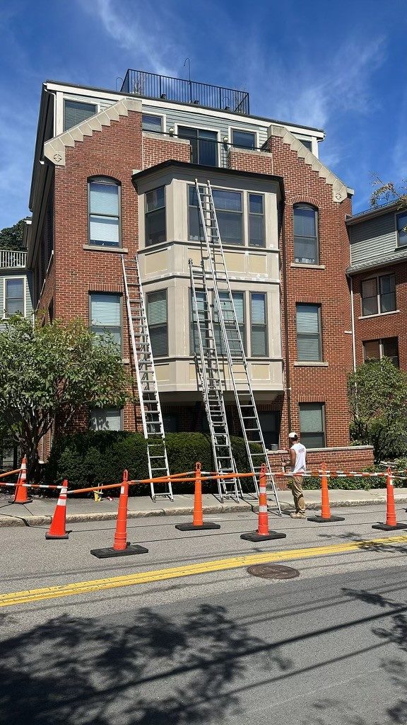 Given the property’s location on a busy street, the project required careful coordination. We obtained city permits, hired a police detail, and implemented a custom traffic plan to keep pedestrians and vehicles safe. To reach the upper levels of the building, we used a 48-foot ladder taller than what most residential projects typically require.