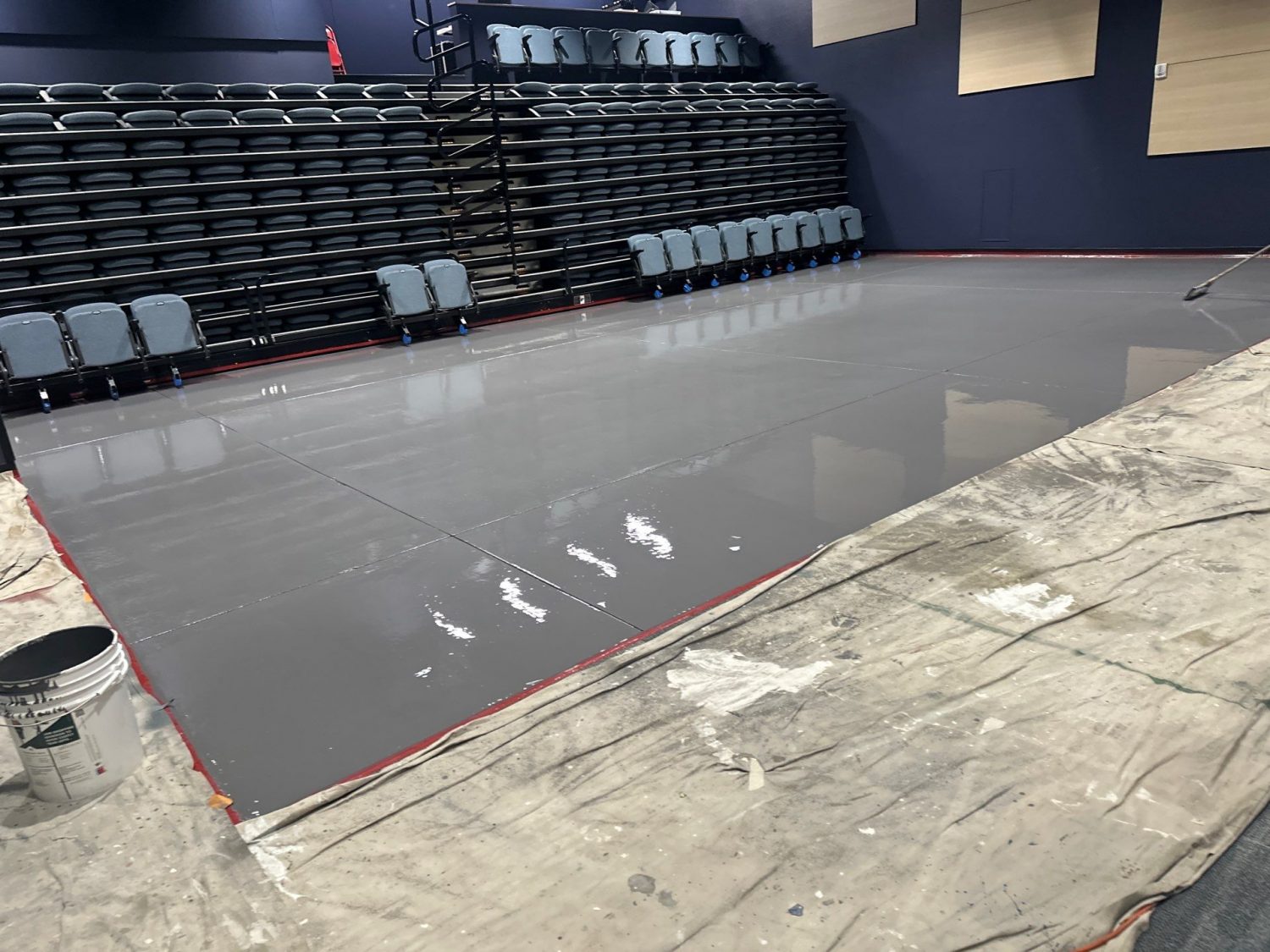 Because the project took place inside an active school facility, protection and containment were essential. Surrounding carpet areas were sealed off with triple-thick plastic barriers, and ventilation and fume management protocols were implemented throughout the enclosed auditorium space. Daily cleanup and jobsite organization ensured the building remained safe and controlled during the restoration.