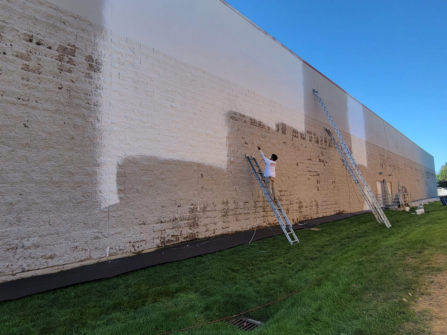 Due to the height of the building, a lift was required as well as ladders on the North side of the building where the ground was not suitable for the lift. Roof access was necessary. Also, the multi-step moisture barrier on the North side of the building detailed earlier.