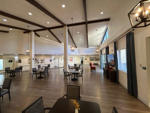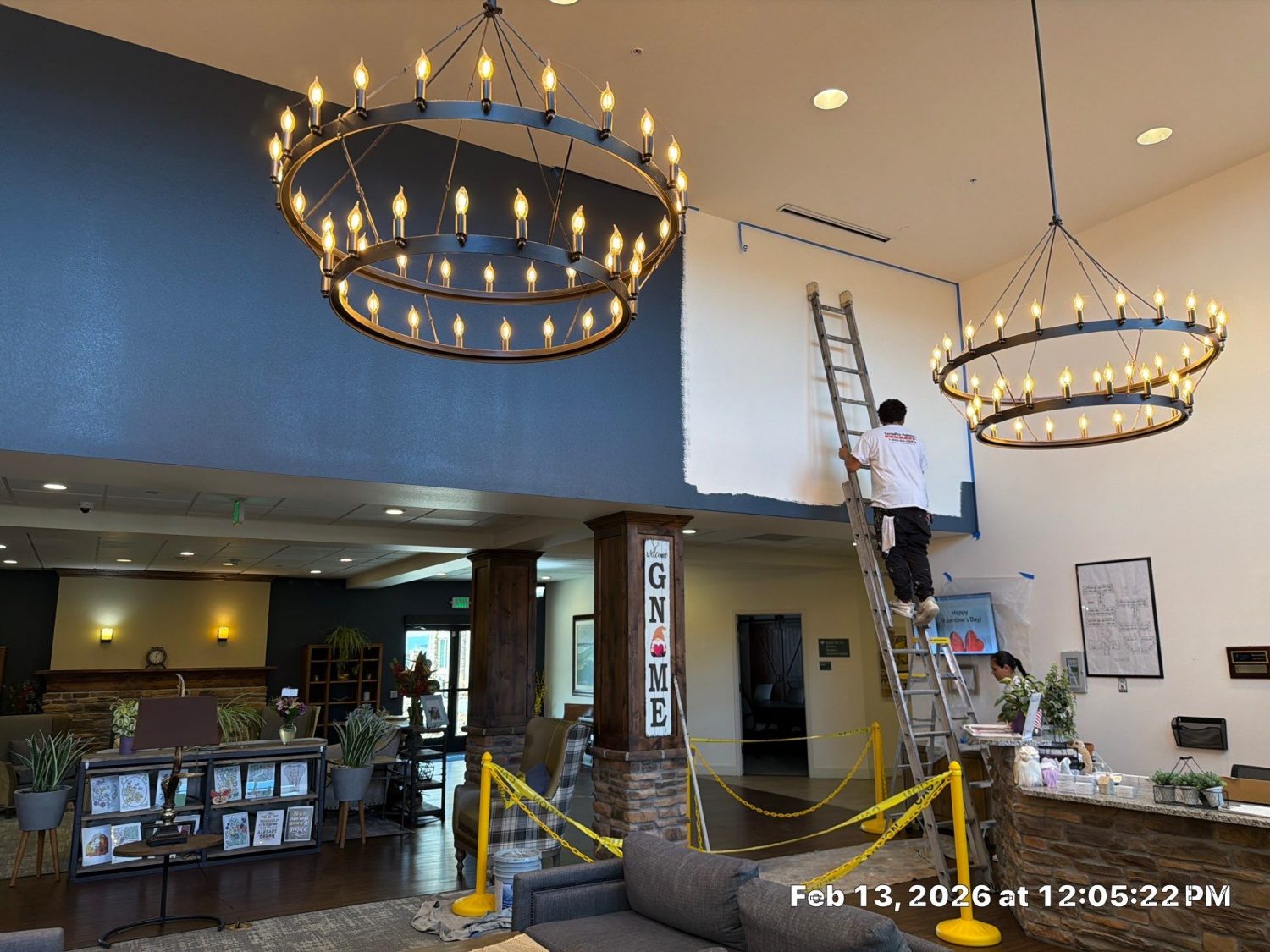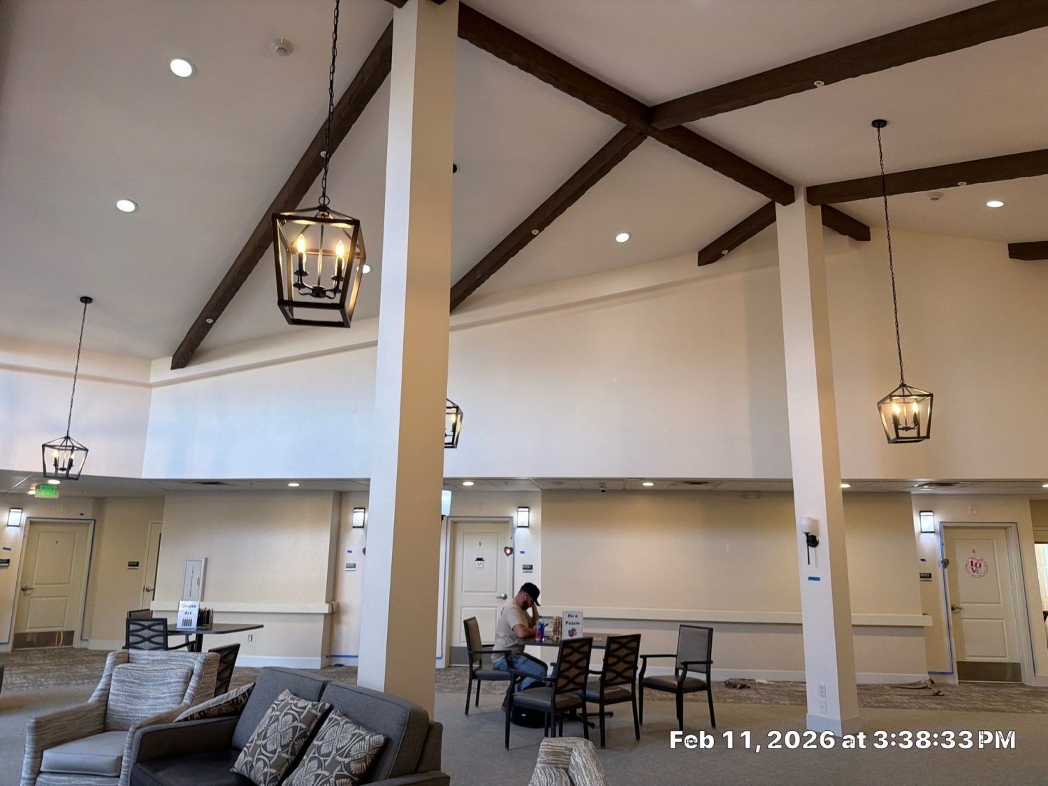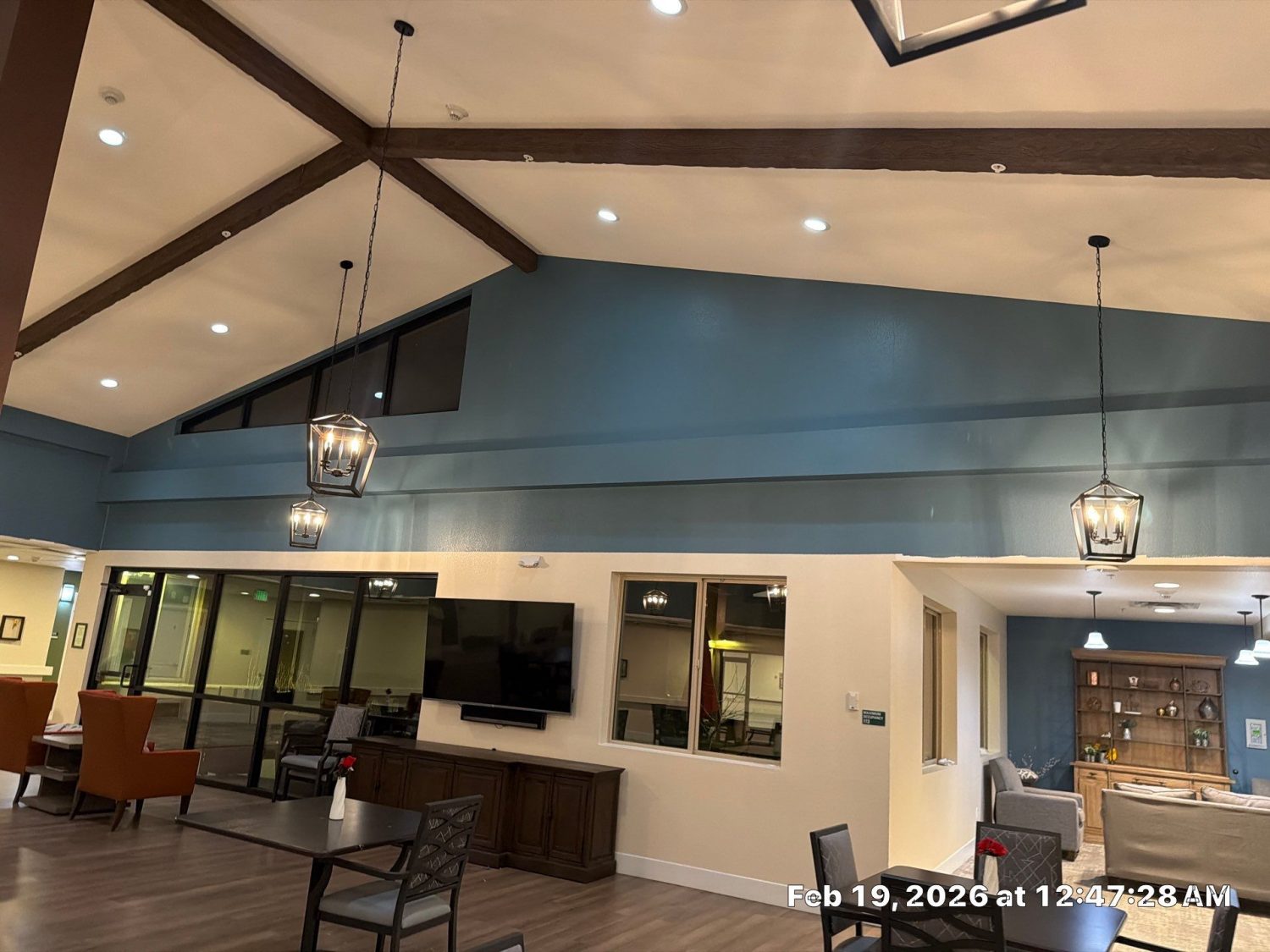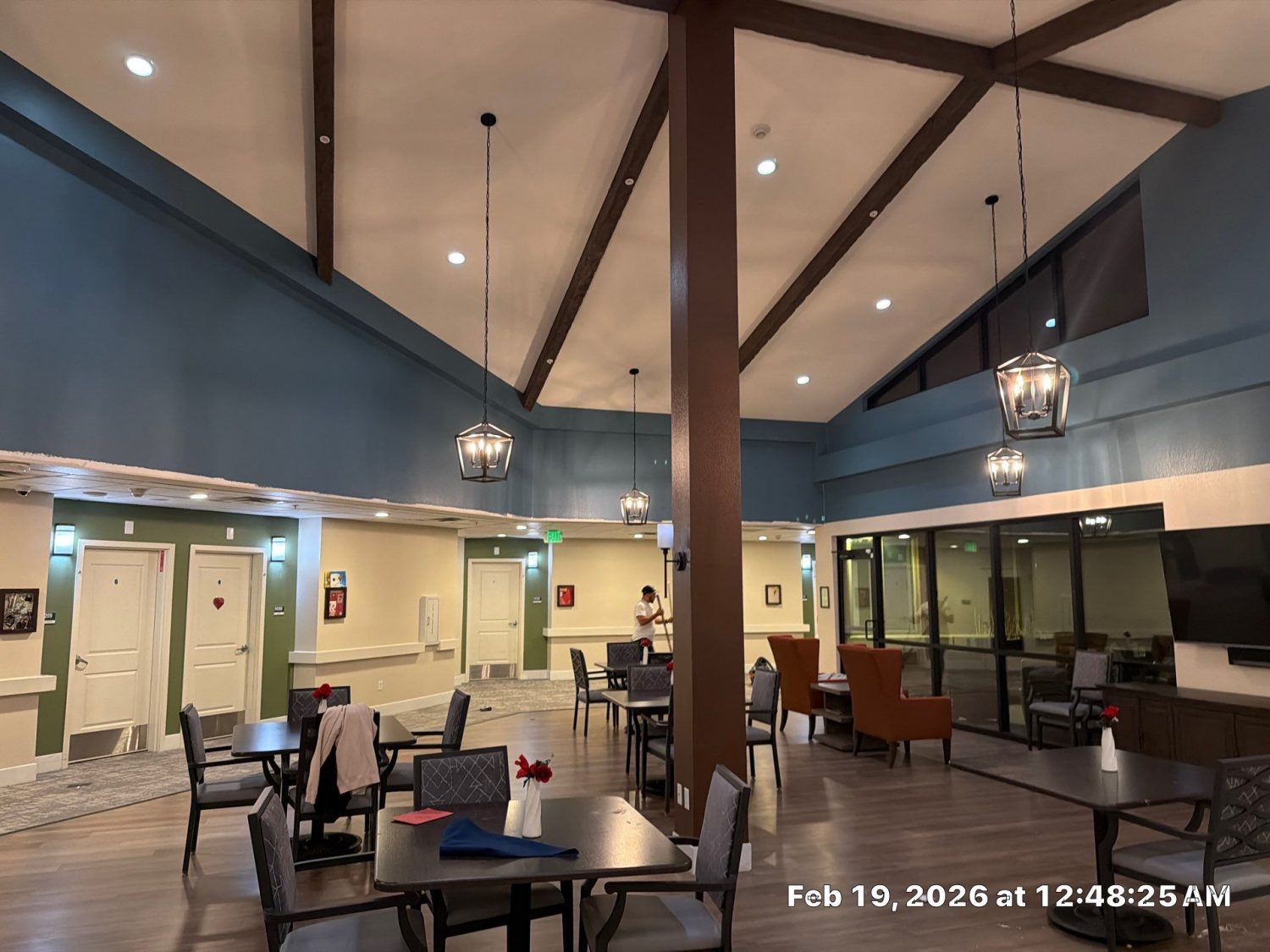 Architectural details presented additional challenges. Cathedral ceiling bumpouts and drywalled soffits in the dining and memory care spaces required careful painting at height using extension equipment to ensure color consistency across difficult-to-reach areas. Coordination was also necessary in the Memory Care Lobby after exposed wiring was removed by the electrical contractor, allowing CertaPro to patch and repaint the affected surfaces before final inspection.