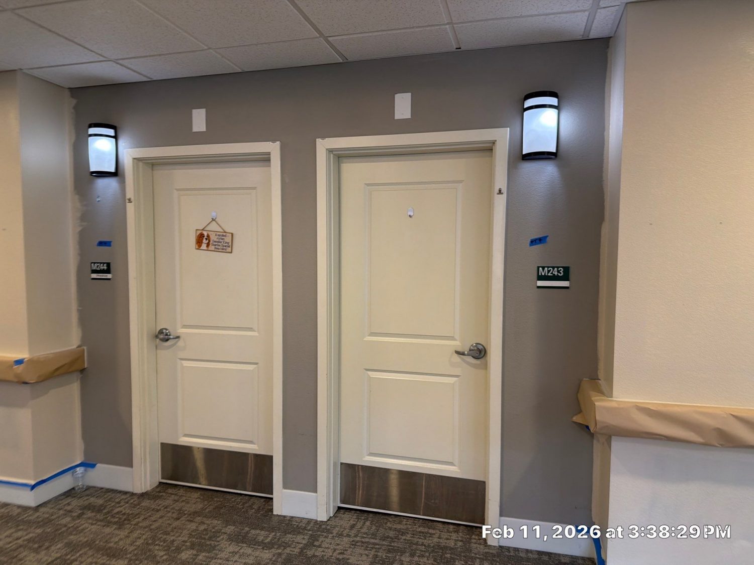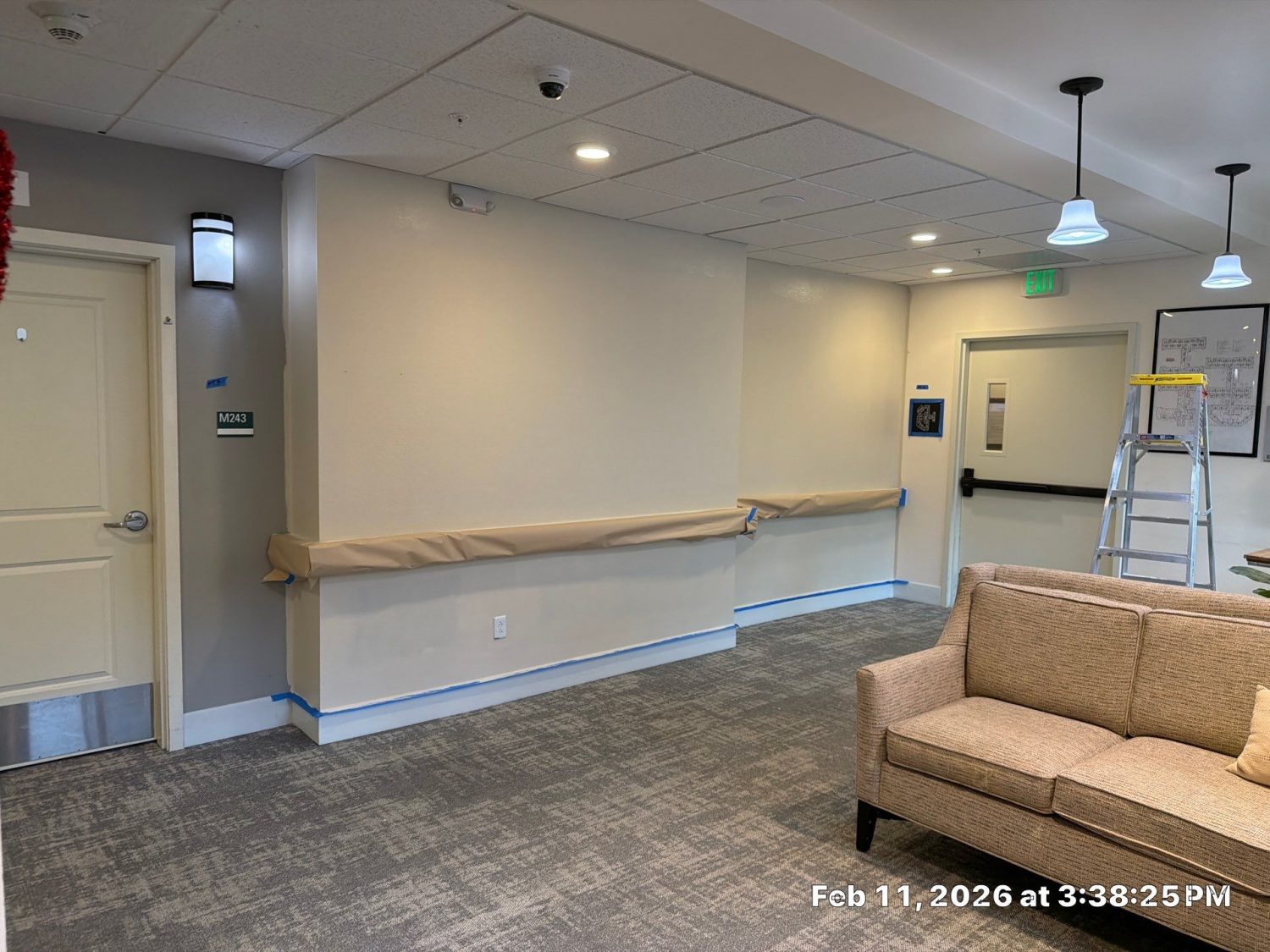 The renovation included a comprehensive combination of interior painting, drywall repair, wallcovering installation, cabinetry refinishing, and specialty interior installations. CertaPro Painters repaired drywall damage, patched areas affected by electrical work, and repainted walls and ceilings throughout multiple common spaces and corridors.