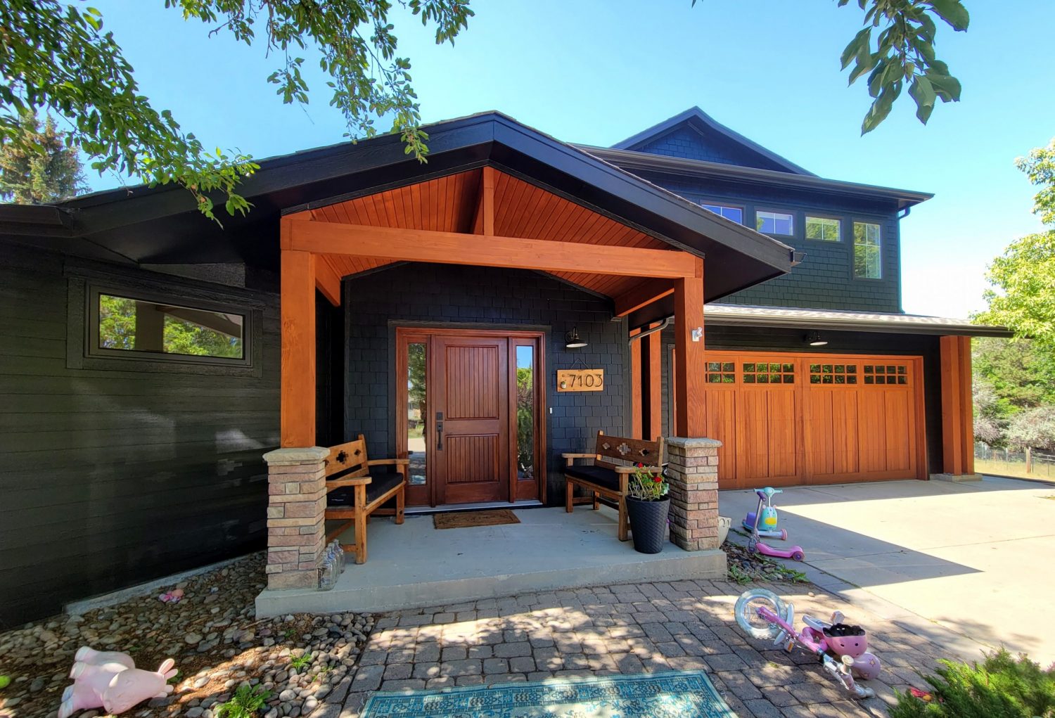 The home was a sun-bleached sage green painted shake-shingle siding with natural wood posts, beams, front entry ceiling, front door and garage door. The stain on the natural wood was worn and cracking. The client requested to paint the cedar siding black, the vinyl window frames black and to re-stain all wood in the original color. Our crew used a high-performance adhesion primer on the vinyl windows before applying Sherwin Williams Emerald Latex paint system. The shake-shingle siding was painted with Sherwin Williams Resilience also in black and all wood was stained with Sherwin Williams Super Deck Alkyd stain system. The home underwent a stunning transformation and the homeowner was very happy with the result.