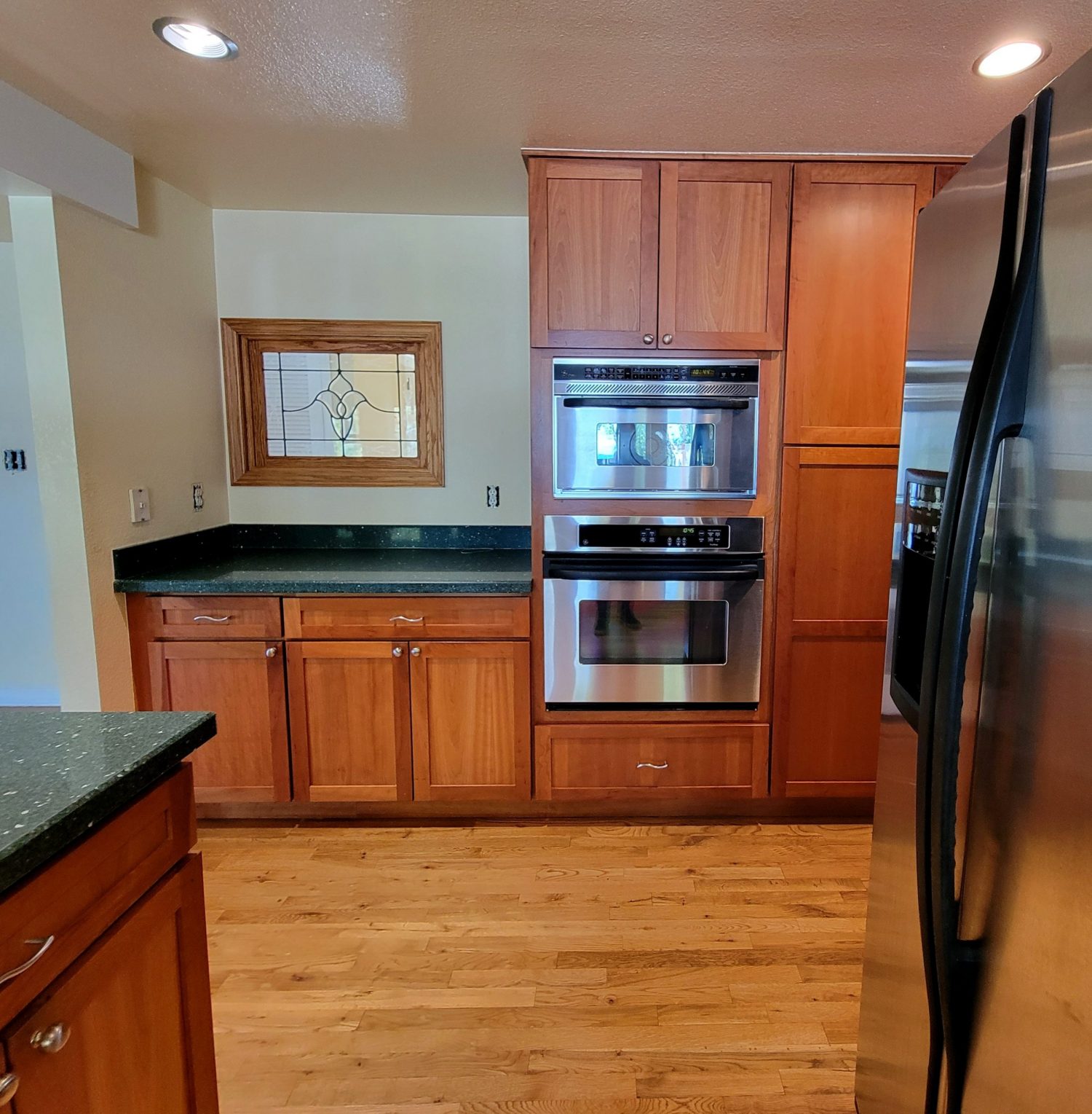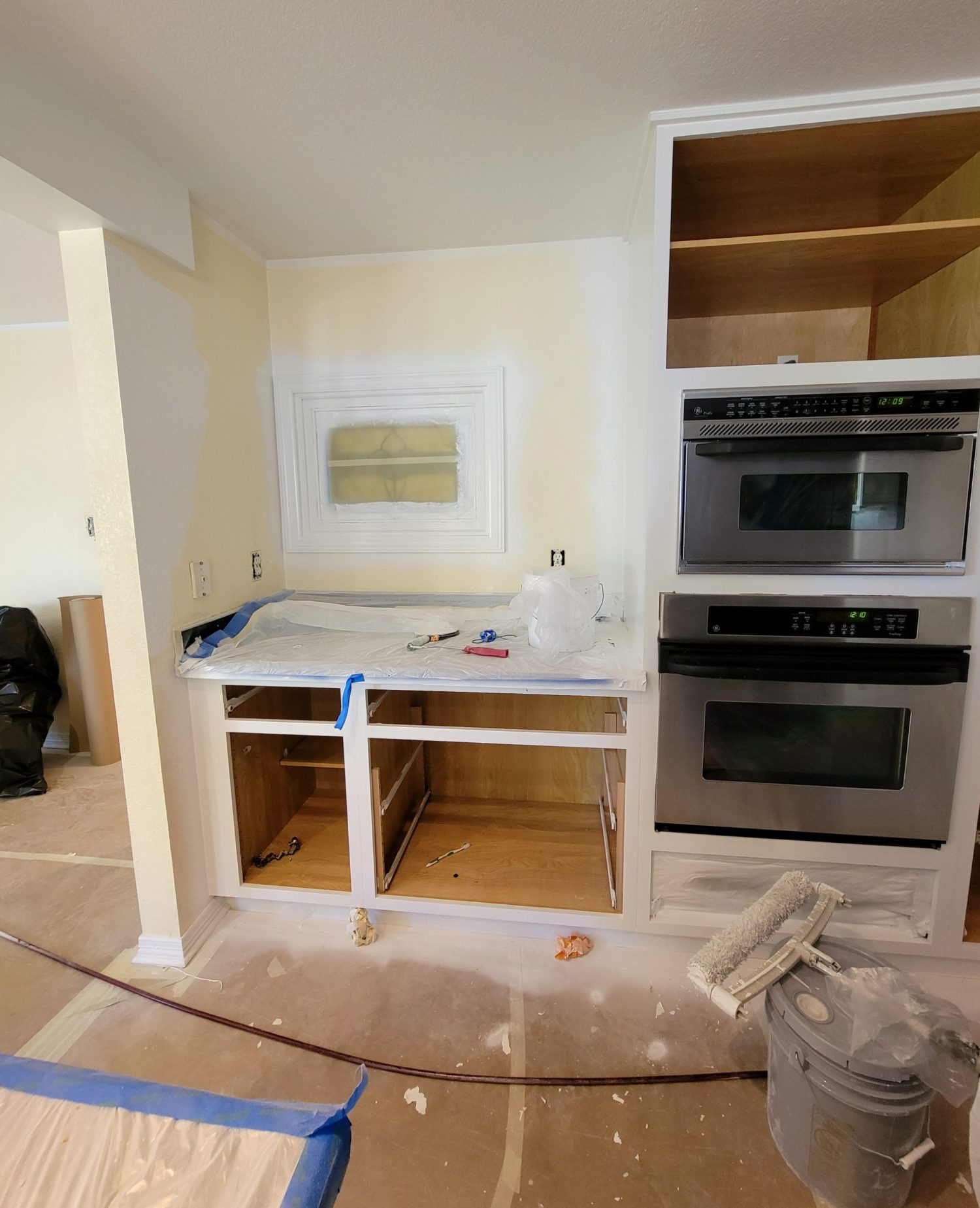 This custom home built in the 1970’s had multiple different colors of paint throughout and stained cabinetry in the kitchen. This case study is focused only on the kitchen. Cabinets were a light wood color with dark green countertops and light wood flooring. The owner of the home chose to have us paint the exterior of all cabinets white to modernize and brighten the space.