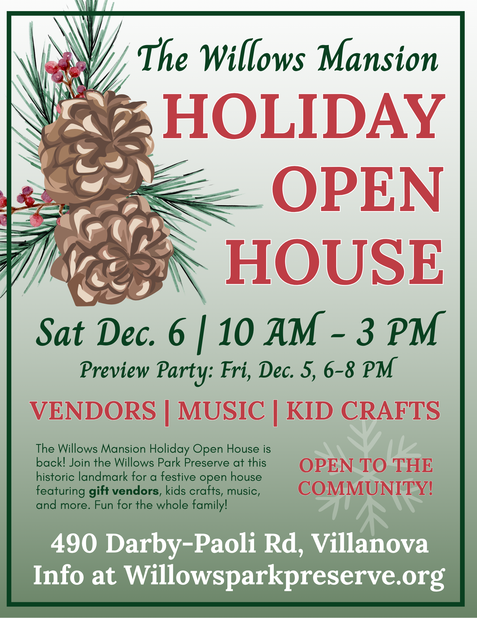Celebrate the season at the Willows Mansion Holiday Open House, hosted by Willows Park Preserve. Enjoy a festive day at the historic Willows Mansion in Villanova with holiday gift vendors, children’s craft tables, hot chocolate, music, snacks, a poinsettia sale, and more. This family-friendly event is free and open to the public, offering a perfect way to embrace the holiday spirit in one of the Main Line’s most charming settings.