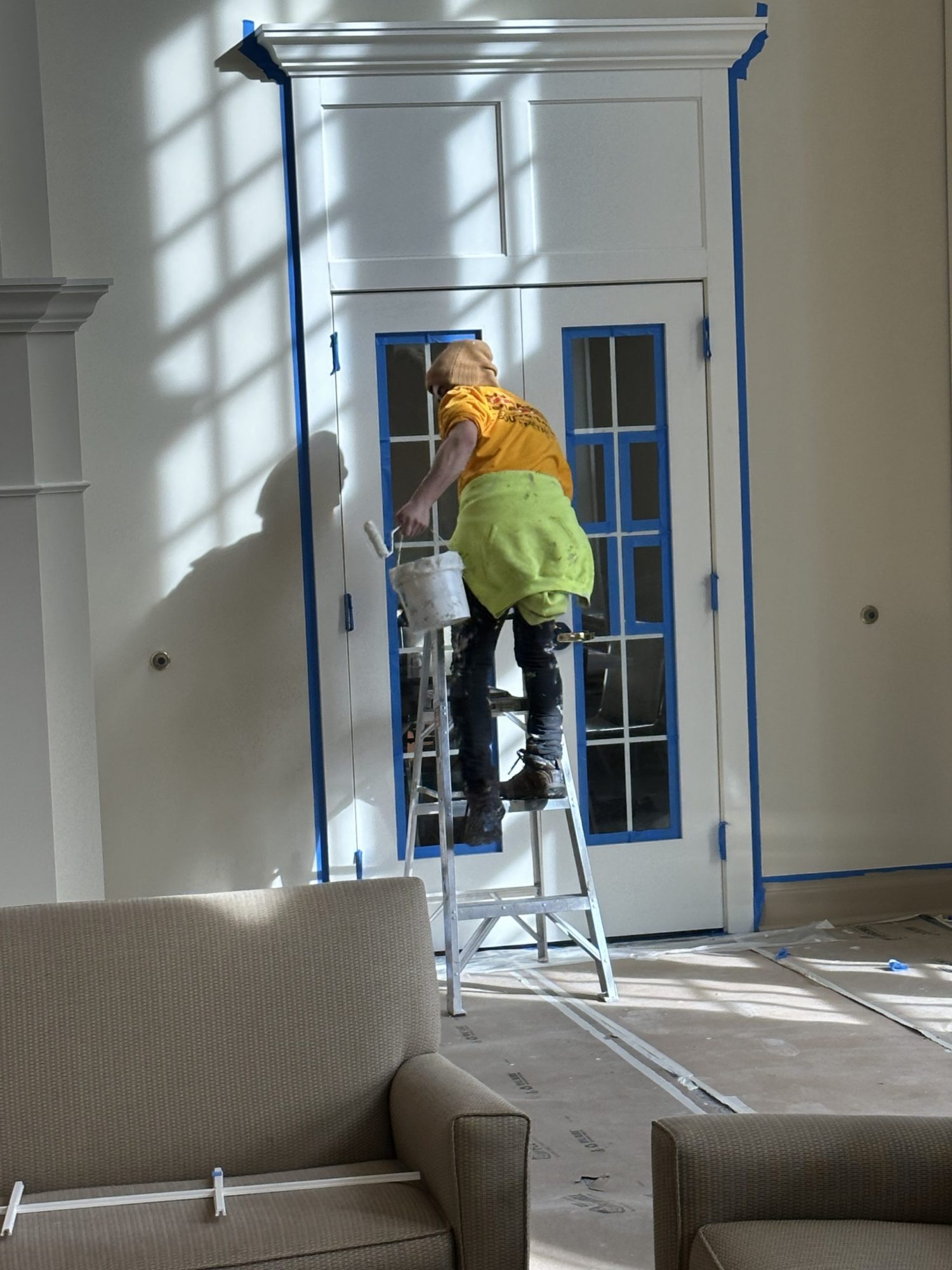 This was the first repaint of the building since it was built in the early 2000’s. Many ceiling areas had cracks and gaps which needed repair prior to painting. All of the windows had gaps and cracks from settling and time. This project involved caulking and minor repair, painting of a vaulted ceiling 25 feet high, caulking and painting of several banks of windows that were each 15 feet high, and painting of doors, walls, and ornate corbels within the room. We had to coordinate church events, which involved flexibility on start and stop times to accommodate for late afternoon / early evening events. All marble floors and carpets were double-covered to protect from paint drops and usage of lift equipment. Flexibility was paramount as there was a funeral scheduled in the room mid-week during our second week, and we needed to stop, clean up and reset to provide respect for the service. We also had to make use of some special equipment and techniques for this project! Two electric scissor lifts were utilized to reach ceilings and taller window areas. Ceilings and trim were all applied by hand due to the delicate/intricate surfaces.