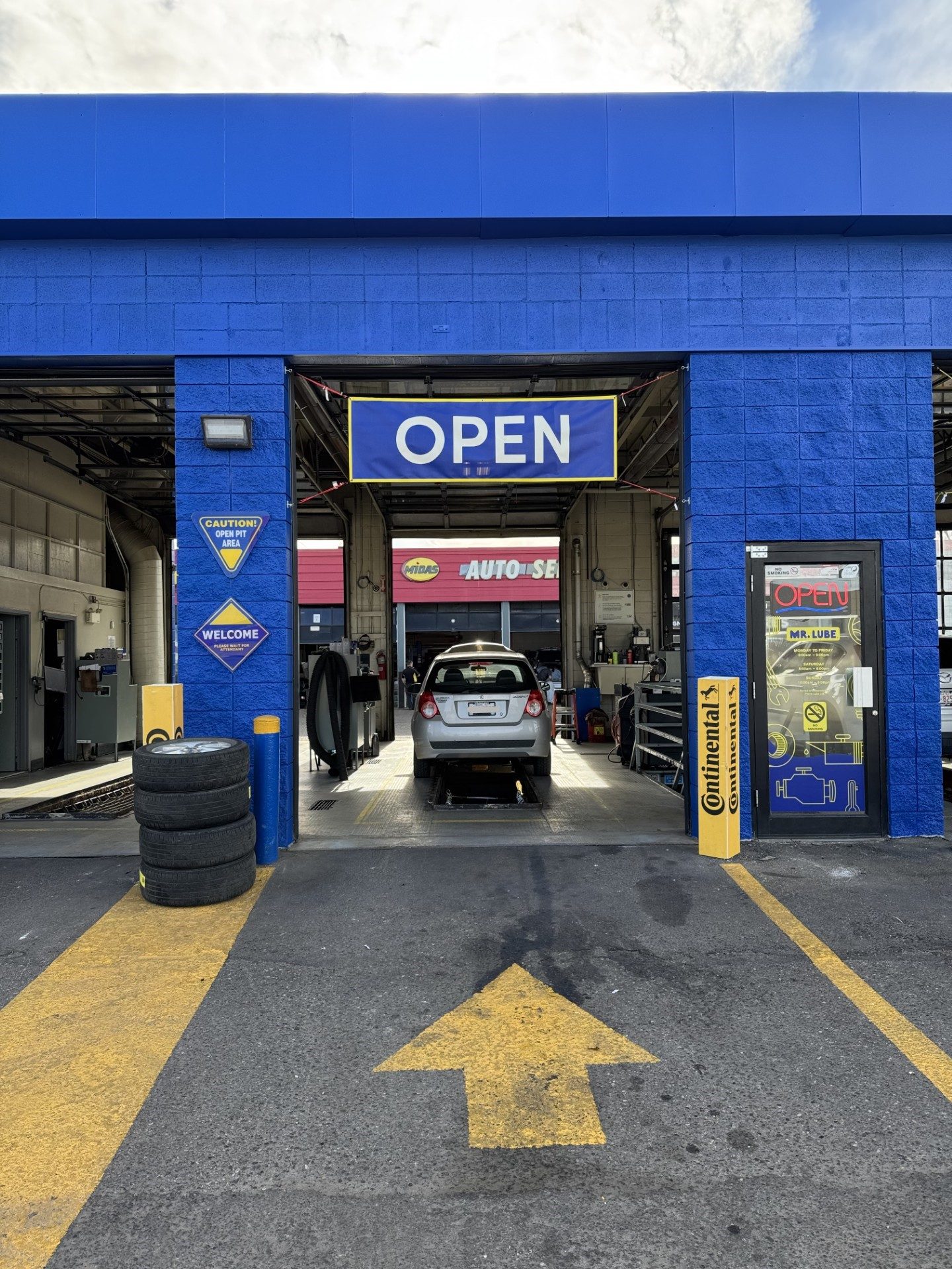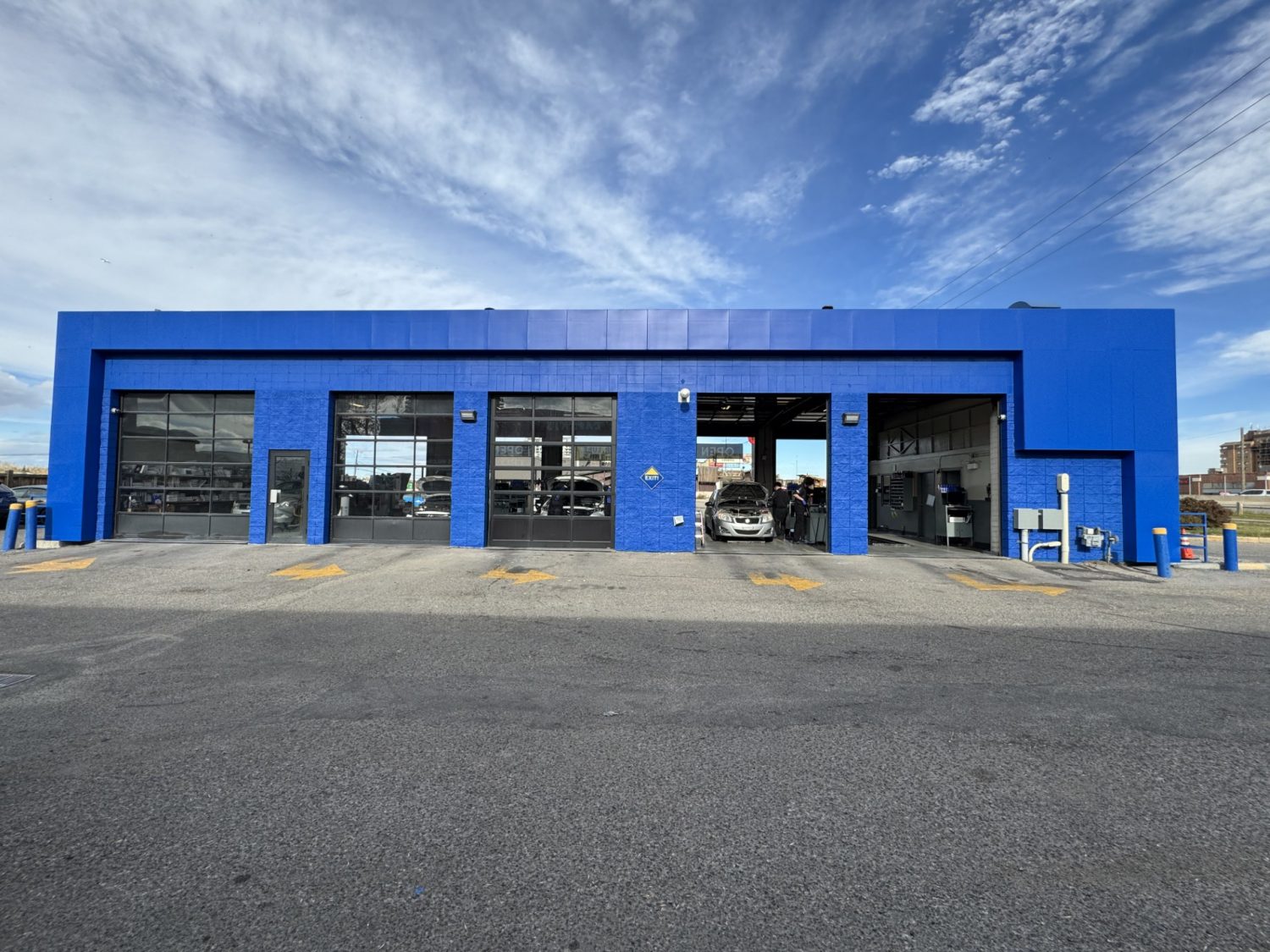 The freshly painted front of the Mr. Lube auto service facility showcases its signature vibrant blue branding.