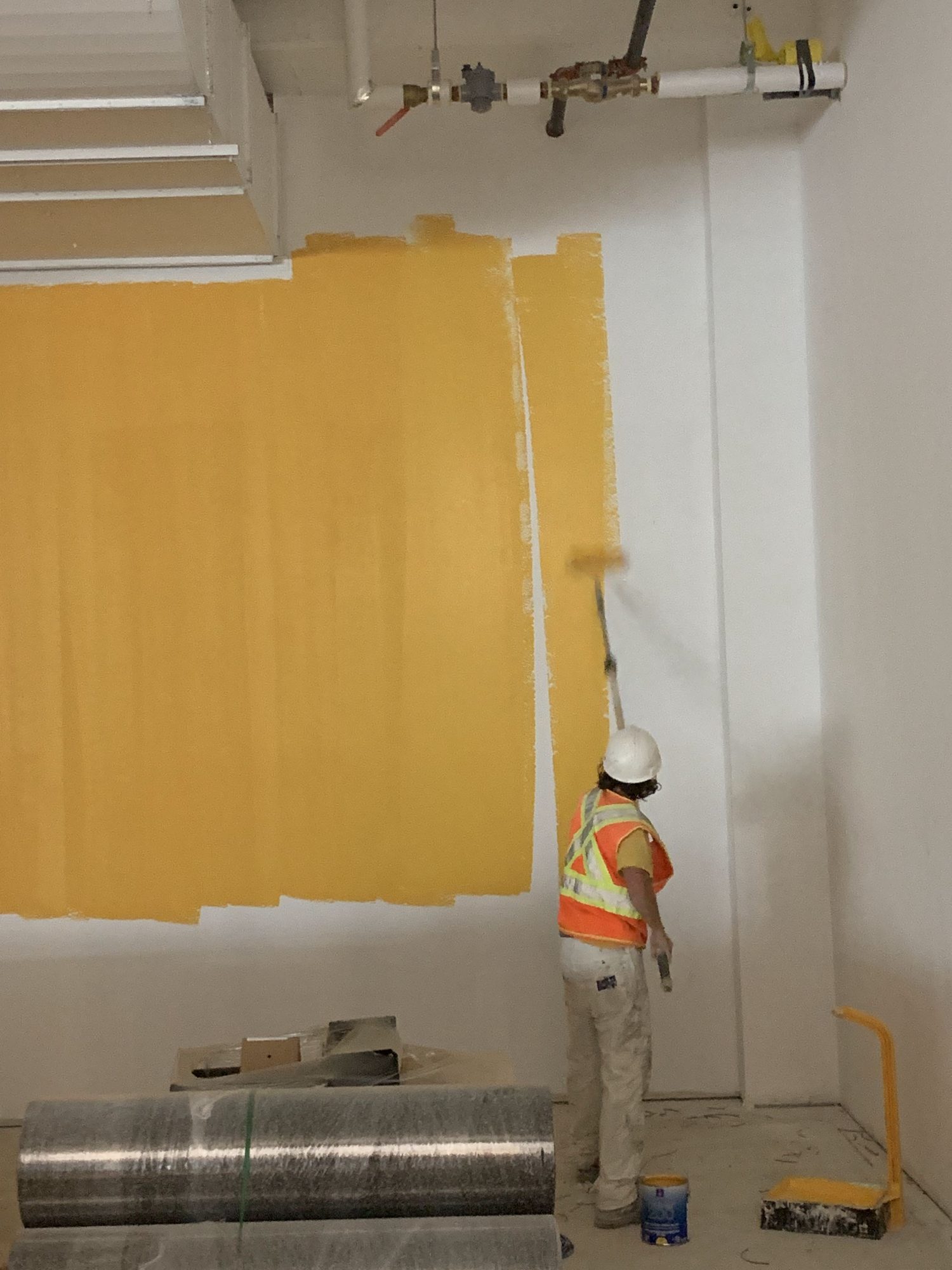 The walls were painted yellow to give the space a bright and inviting feel. Since some of the walls were 18 feet high, we used extension rollers to cover large areas efficiently.