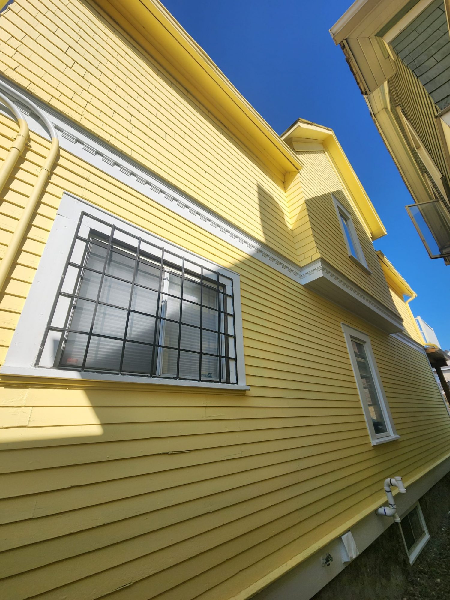 This is a two-and-a-half story home with not much room between buildings, so reaching the upper level gable peaks proved difficult. With the neighbour’s permission, the crew ended up securing their ladders the neighbouring home and utilizing sprayer extensions to properly coat the hard to reach peaks.