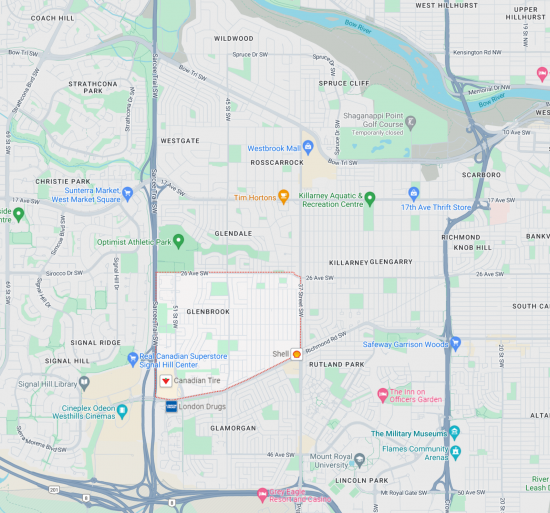 Glenbrook, located in the southwest quadrant of Calgary, Alberta, Canada, is a residential neighborhood known for its friendly atmosphere and convenient access to a variety of amenities. Established in the 1950s, Glenbrook is bordered by 26 Avenue to the north, 37 Street to the east, Richmond Road to the south, and Sarcee Trail to the west. The community boasts a mix of single-family homes, townhouses, and low-rise apartments, catering to a diverse demographic of residents. Glenbrook is highly valued for its accessibility to downtown Calgary, only a 15-minute drive away, making it a popular choice for commuters.