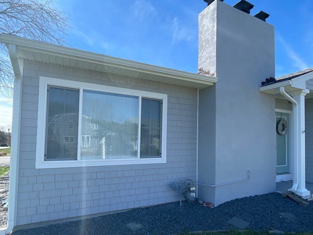 The project involved repainting the shingles, trim, front door, and chimney. Despite the aggressive surface preparation required, extra care was taken during power washing and sanding to avoid damaging the shingles.