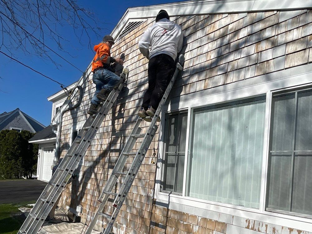 Our team began with an eco-friendly power wash to remove dirt and surface debris. Due to the severity of the peeling, we performed aggressive sanding on the shingles far beyond the standard light sanding typically used. This helped eliminate as much of the failing stain as possible, setting the foundation for long-term adhesion.