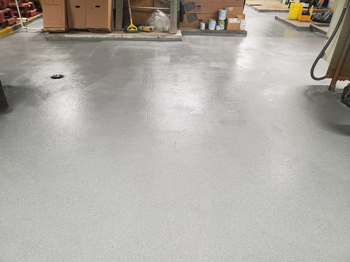Concrete floor preparation with diamond grinding. Muti-coat Quart’s flooring system.