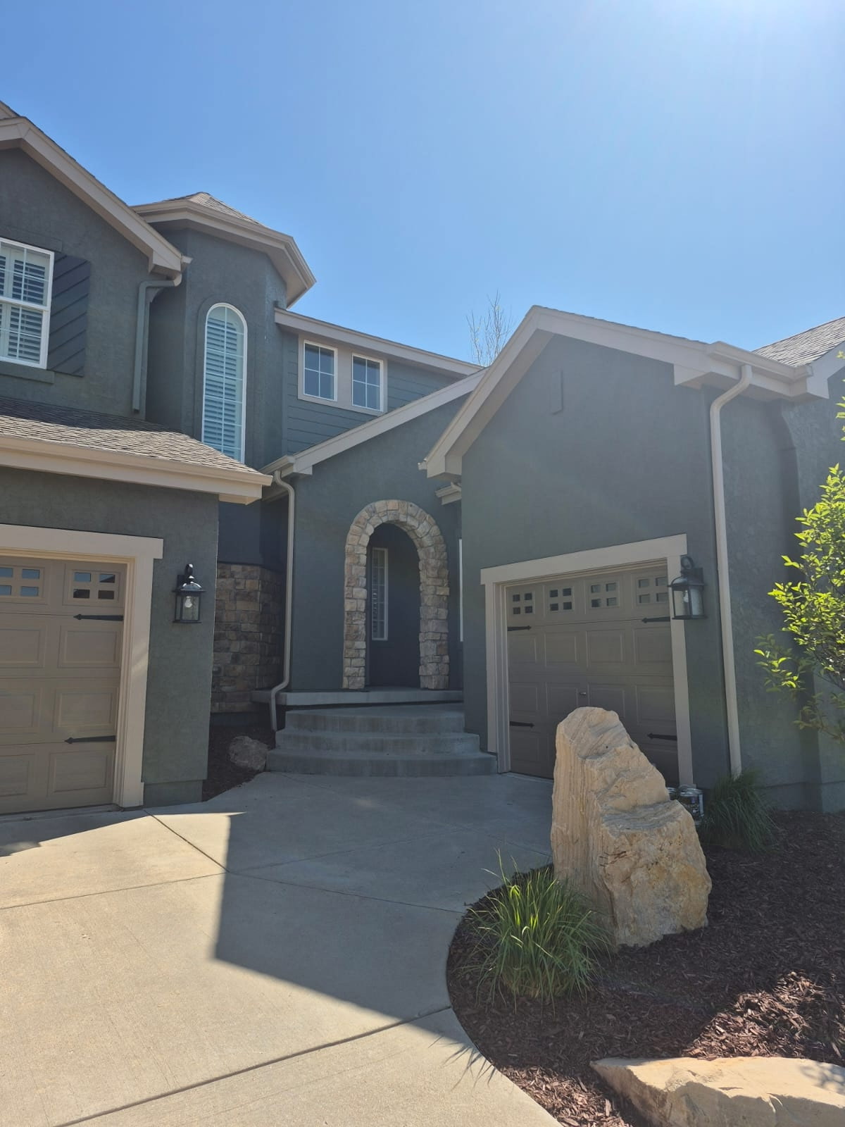 For this home project, our team painted the standard siding, stucco, soffits, fascia, downspouts, gutters, doors, door frames, window frames, and front porch ceiling on the exterior of the home.