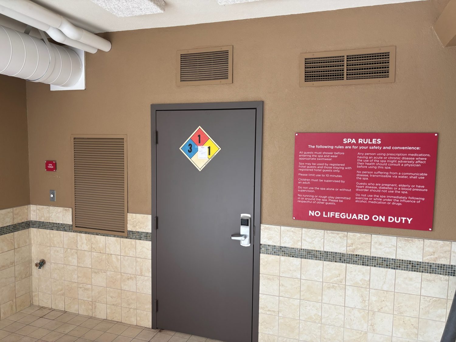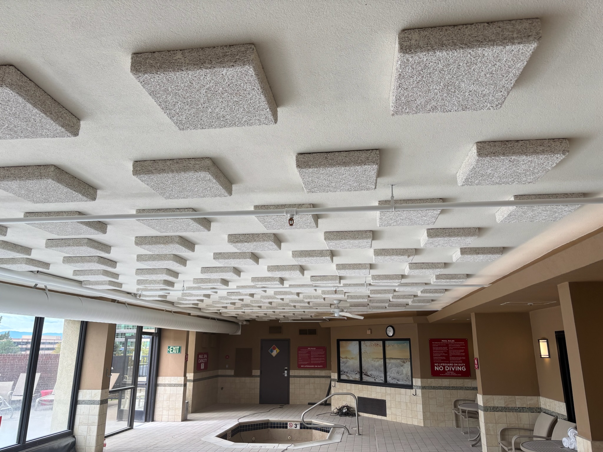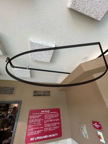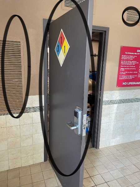 Our team prepared, primed, and repainted the black fire suppression sprinkler pipes and metal vents in the hotel pool area, transforming them to blend seamlessly with the ceiling for a cleaner, less conspicuous look. We also refreshed the maintenance room door with a new coat of paint, enhancing the overall appearance and appeal of the space.