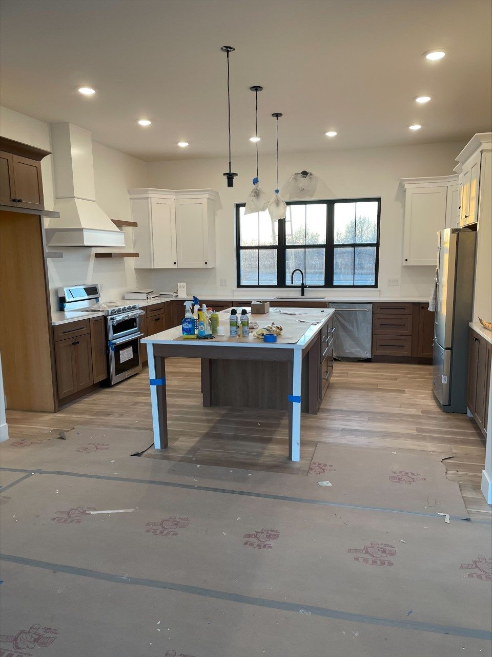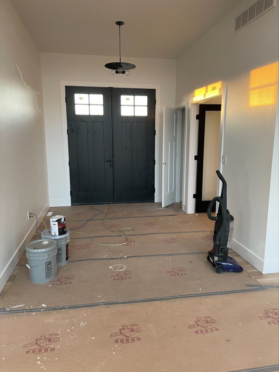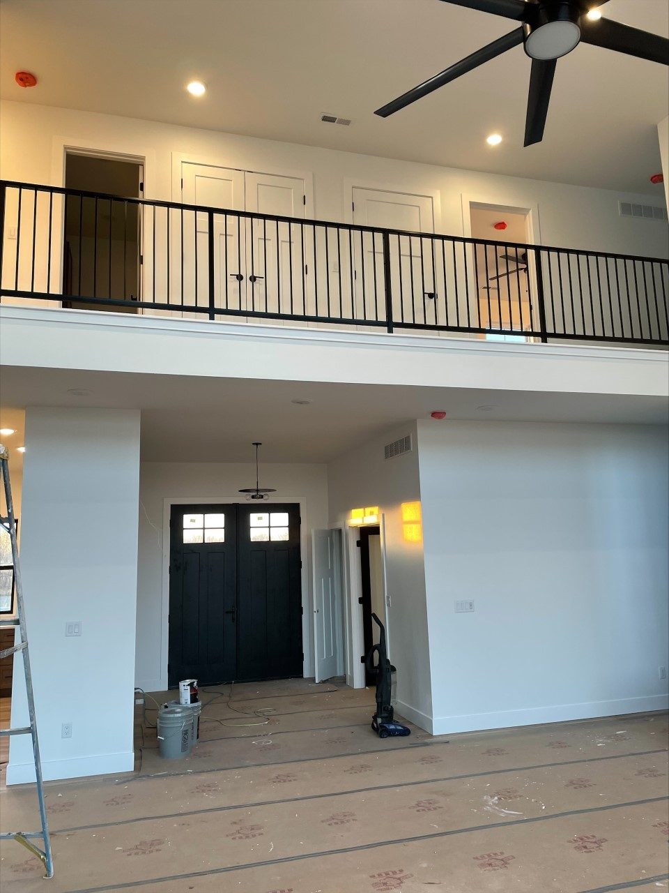 This project was completed in a newly constructed home located in Iowa City. This is a custom home with built ins and high areas. The end result looked really clean an crisp with the combination of white and black.