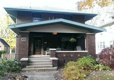 Light yellow siding with green window trim in Bloomington/Normal, IL