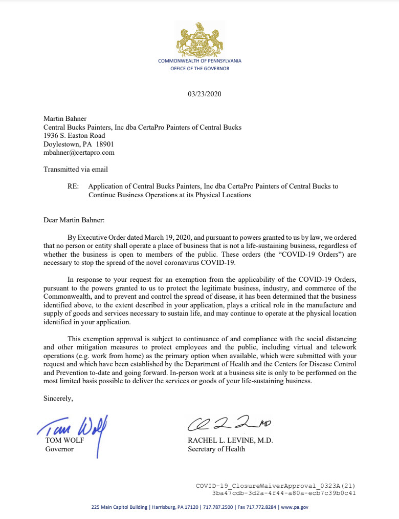 CertaPro Painters of Central and Lower Bucks County has received permission from the Pennsylvania Office of the Governor to remain in operation during the COVID-19 business closure order. We received the following message from the Governor’s office: