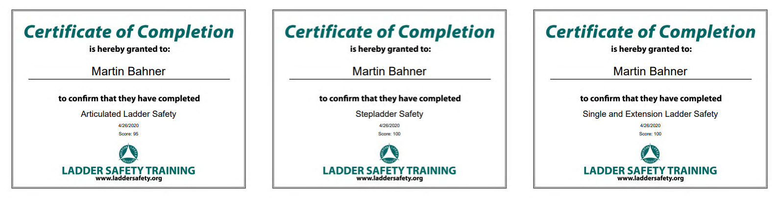 Additionally, Martin has received certifications in Ladder Safety Training for Articulated Ladder Safety, Stepladder Safety and Single and Extension Ladder Safety.