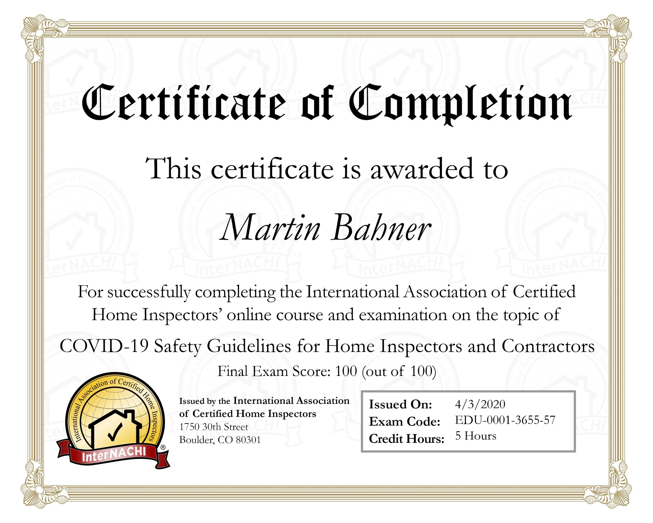 Martin has received a certificate of completion for the International Association of Certified Home Inspectors’ online course and examination on the topic of COVID-19 Safety Guidelines for Home Inspectors and Contractors.