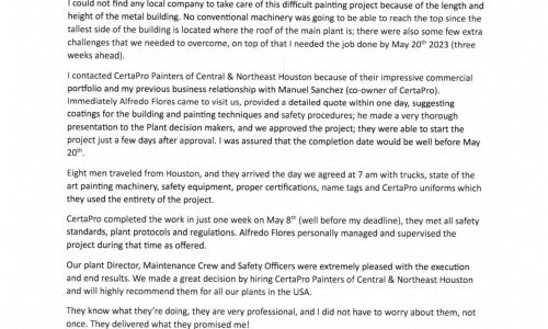 CertaPro Painters of Central & Northeast Houston began working on this project in May of 2023. For this job, we utilized an 8-man crew to carry out the process of pressure washing, priming, and painting the building and A/C units. This project’s complexity resulted from the fact that it occurred out of state and was a particularly large job, requiring a great deal of coordination and planning. Travel accommodations were made to be certain that all the necessary materials, documentation, equipment, and heavy machinery were ready and on time. Several hundred gallons of paint and primers were required to complete the job, but despite all these challenges, our team persevered and successfully completed the project.