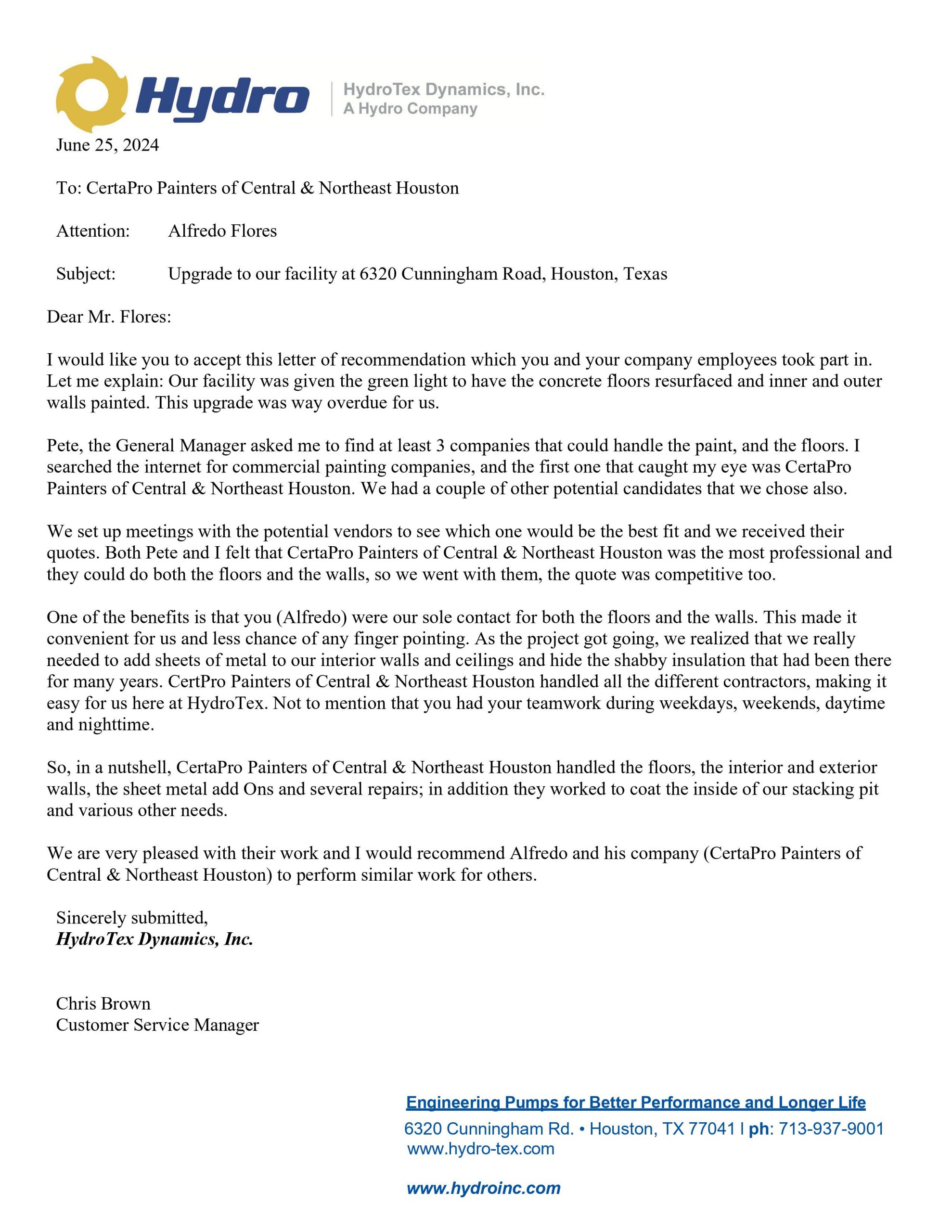 Letter of Recommendation for CertaPro Painters of Central & Northeast Houston