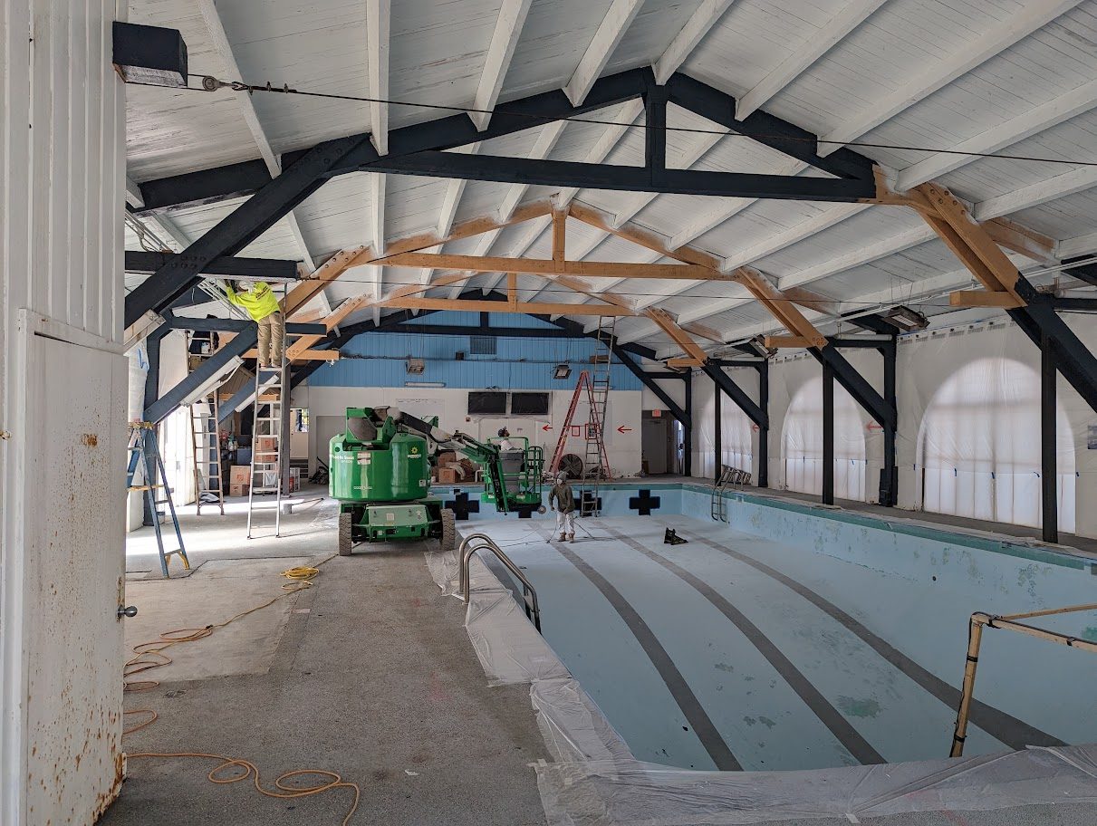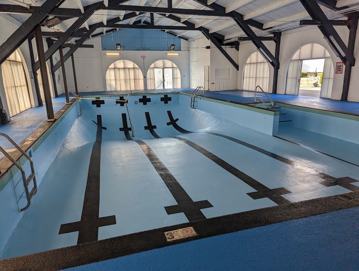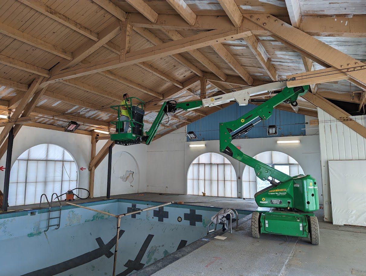 Having completed several exterior and interior projects at the historic Aurora Inn, when it came time to freshen up their tired pool, Managing Partner Franz Bauer turned to us for expertise. The materials are all two-part epoxy products for moisture resistance. Starting at the top, the ceiling was completely washed. Most areas required a full prime plus two sprayed topcoats. The pool deck and locker room floors used a non-slip additive, as did the shallow end and steps of the pool proper. Following a two-week cure time the pool will be reopened, just in time for spring. Keep scrolling to see all of the photos from this project!