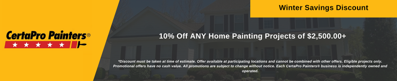 *Discount must be taken at time of estimate. Offer available at participating locations and cannot be combined with other offers. Eligible projects only. Promotional offers have no cash value. All promotions are subject to change without notice. Each CertaPro Painters® business is independently owned and operated.