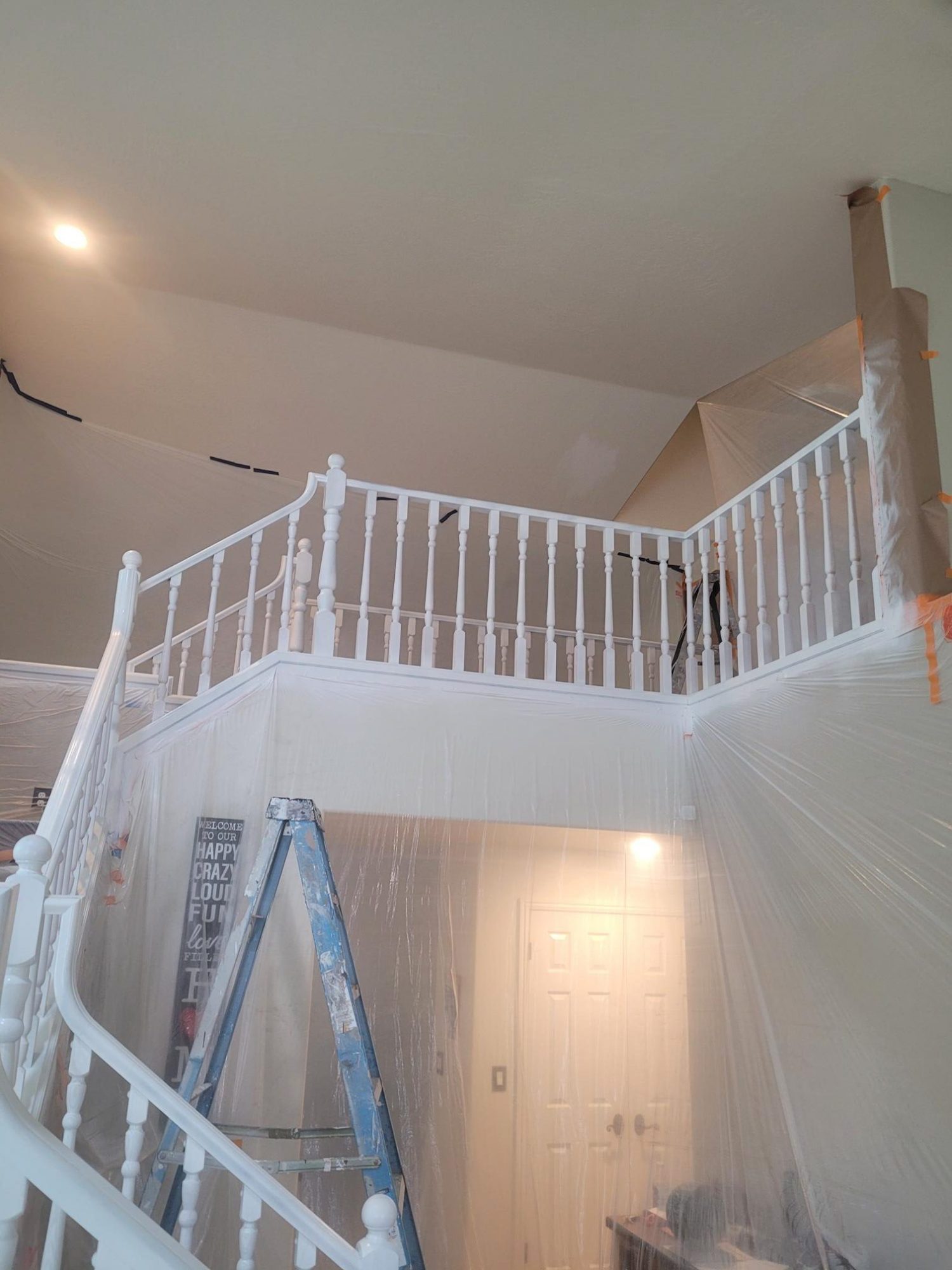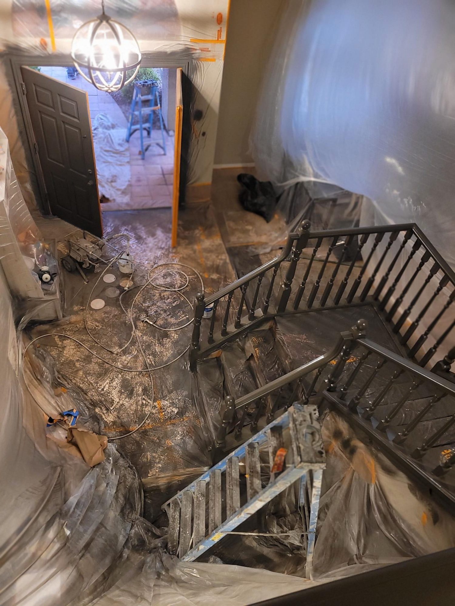 This was an interior banister project we did. It was a wood finish with a clear coat on top. To do these kind of jobs we thoroughly sand down the surface to remove the clear finish and apply the strongest primer we can get our hands on so that the paint will stick and not sheer off with the amount of hand traffic railings see. We then applied a urethane semi-gloss top coat in Sherwin-Williams urbane bronze color. The result is very slick!