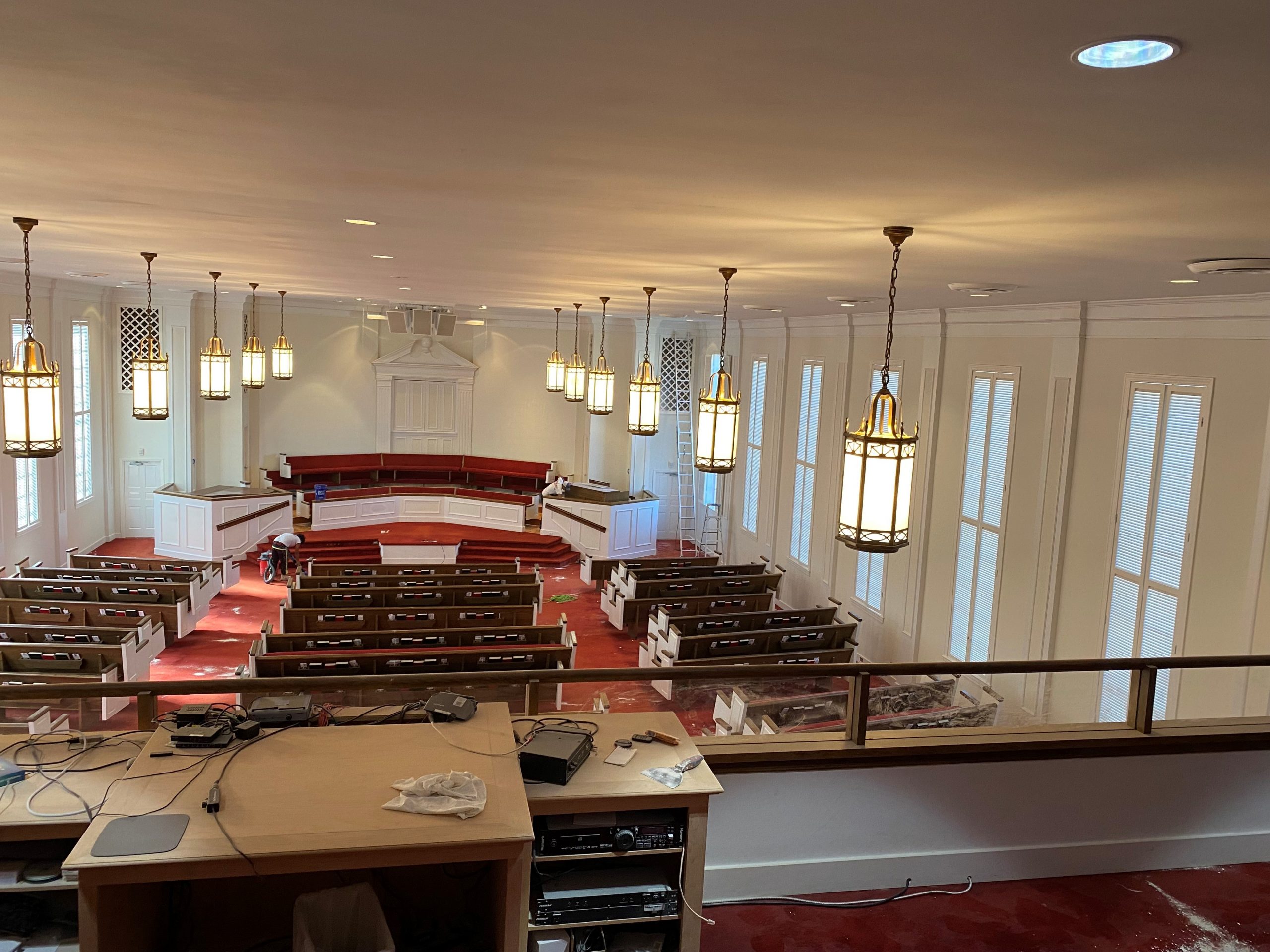 26-foot tall ceilings on a sloped room. We had to move pews, and cover the entire sanctuary in plastic. We had to set up scaffolding. The stage area required us to break down and rebuild the scaffolding on multiple levels of the stage floor.